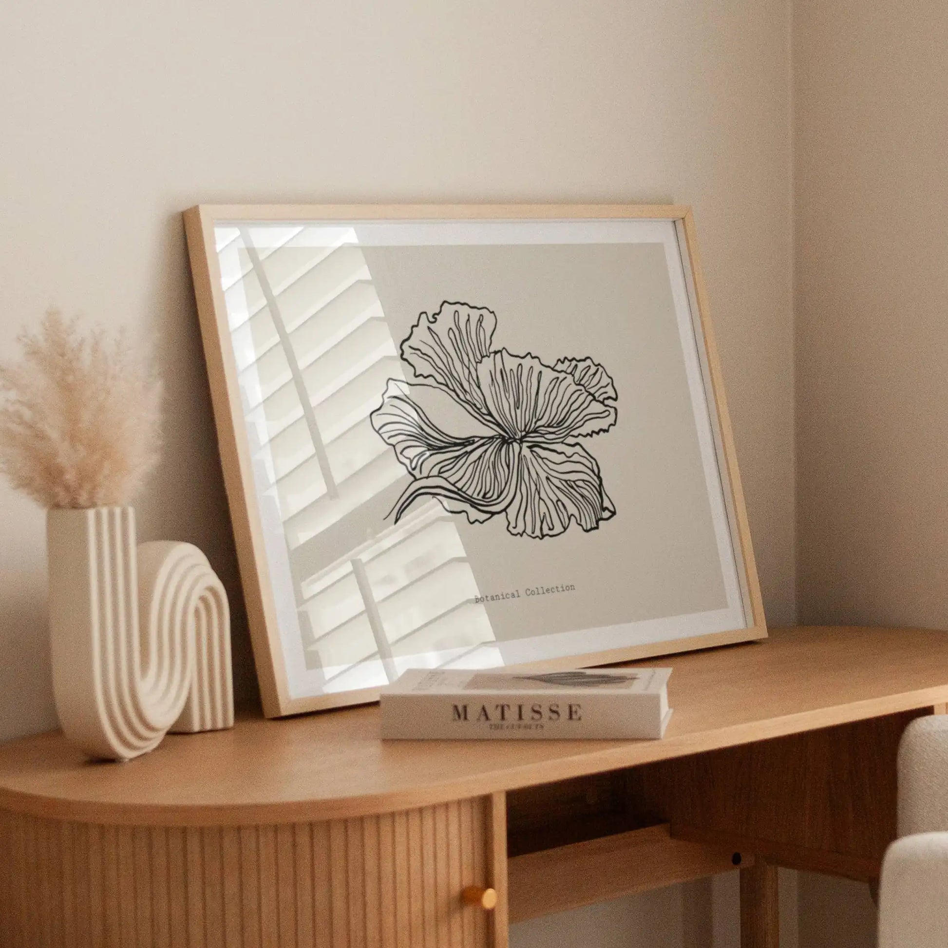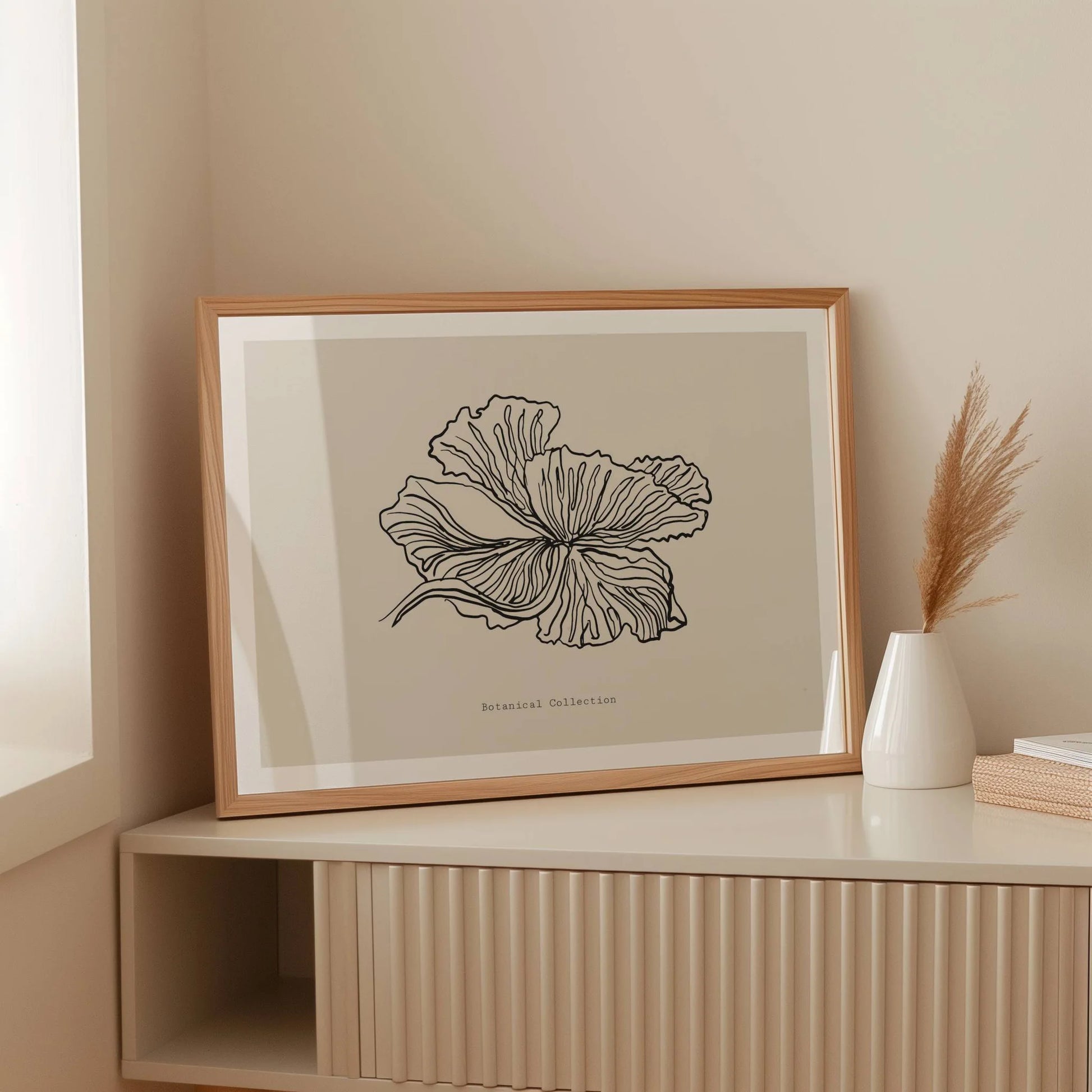 Decorative poster featuring a flower drawn with black lines on a beige background. This minimalist design showcases detailed flower petals. Perfect for decorating your living room or bedroom.