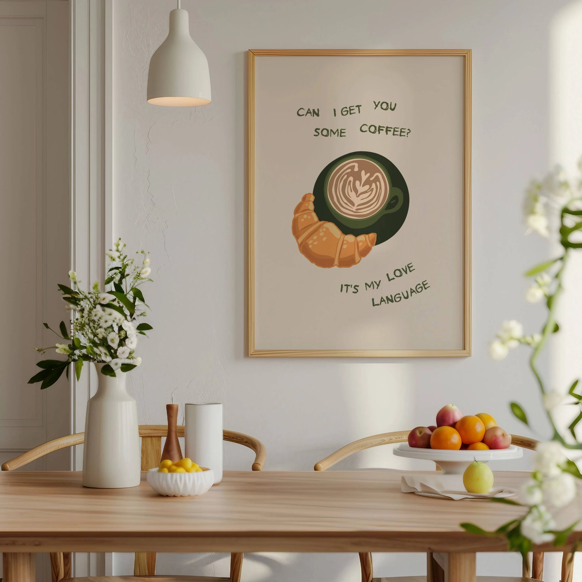 Decorative coffee poster featuring a green coffee cup and an orange croissant on a beige background. Includes the phrase 'Can I get you some coffee? It's my love language'.