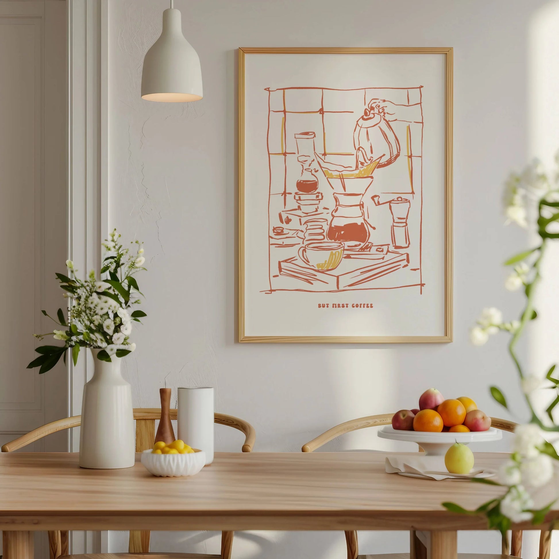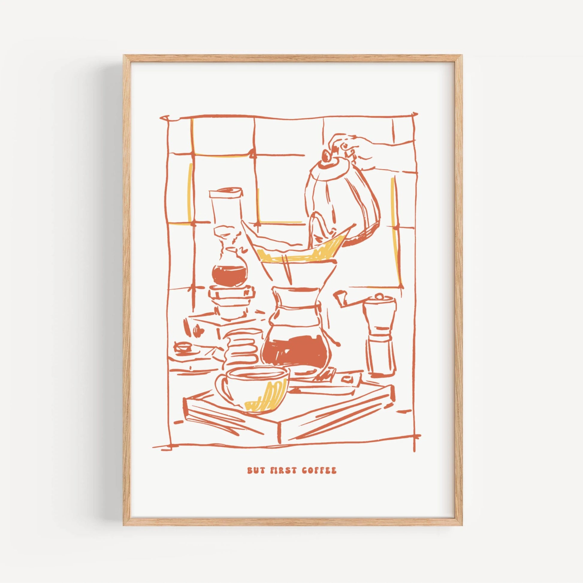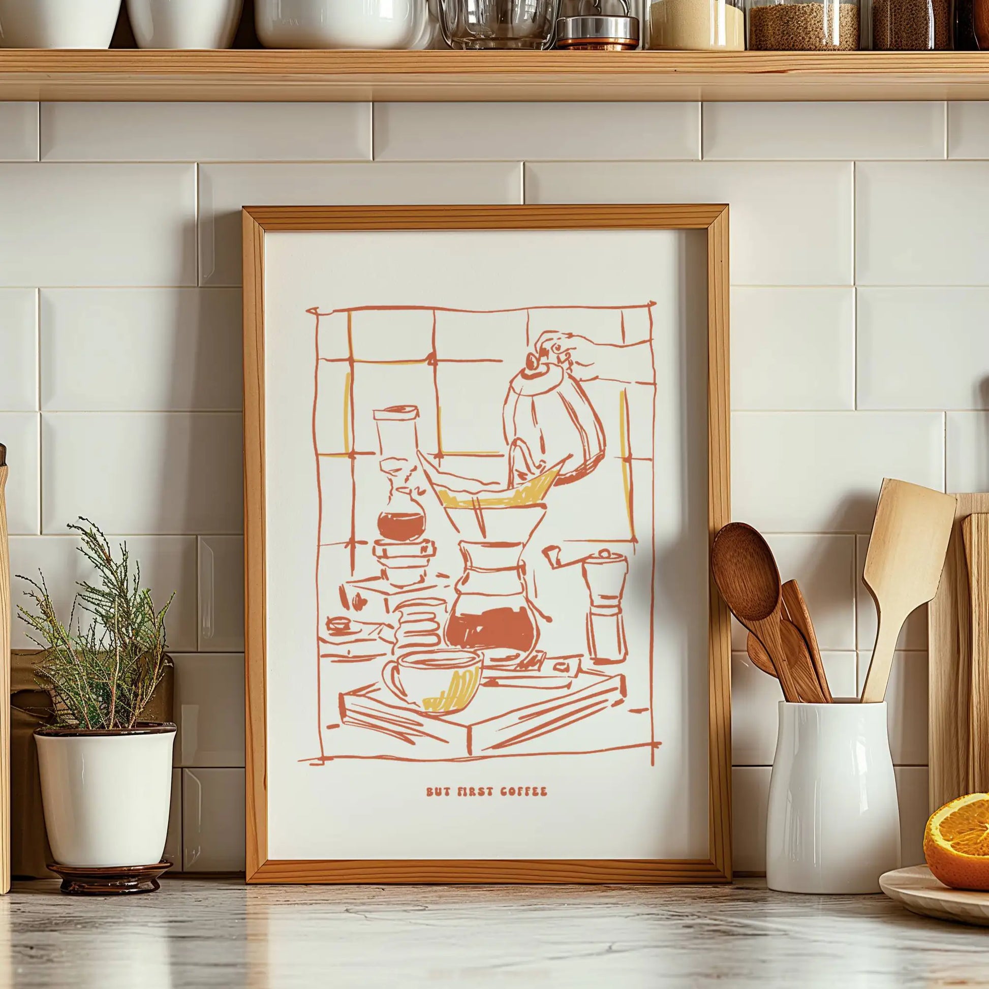 Decorative coffee poster featuring a simple red and yellow drawing of coffee essentials like a coffee maker, cup, and grinder. Perfect kitchen wall art for coffee lovers.