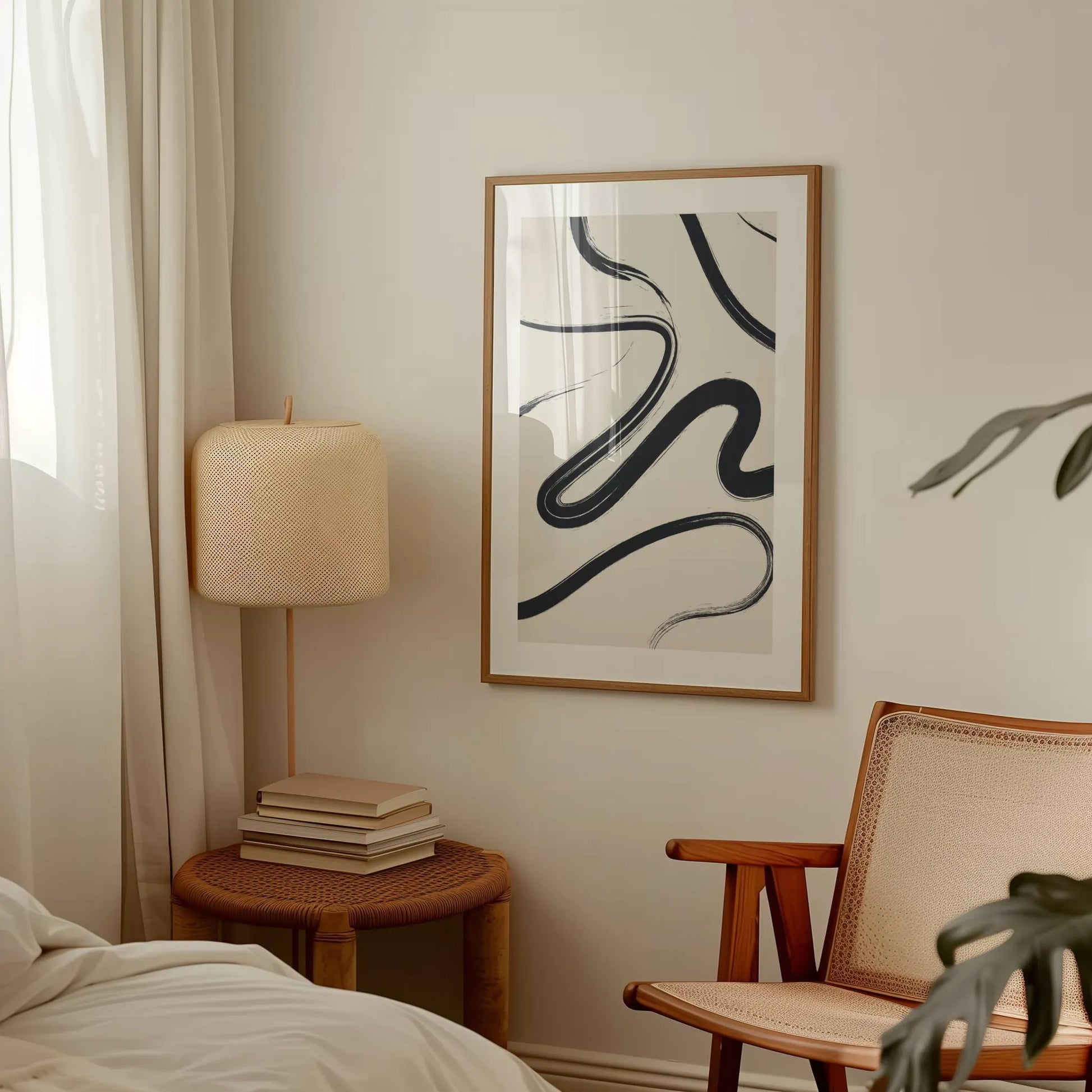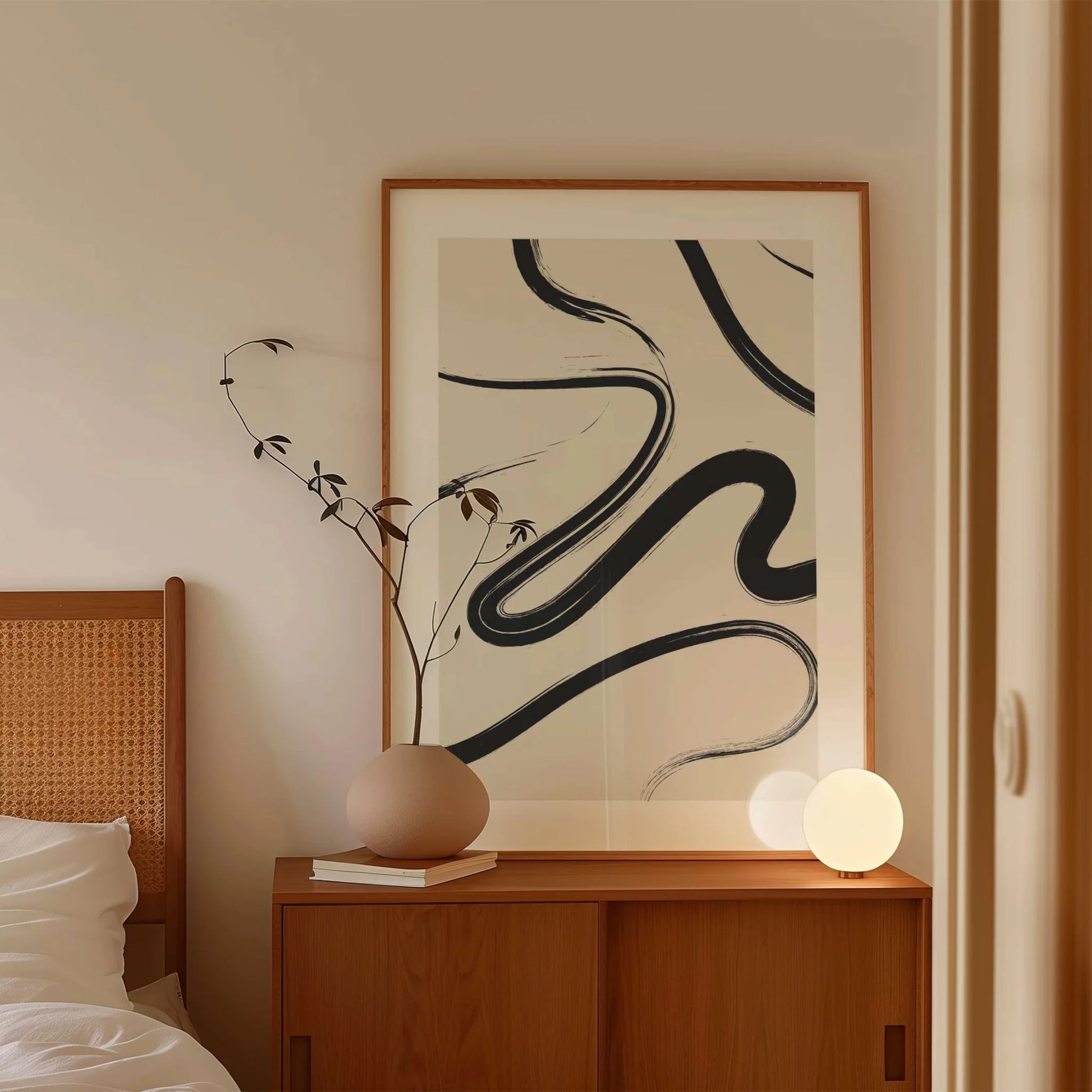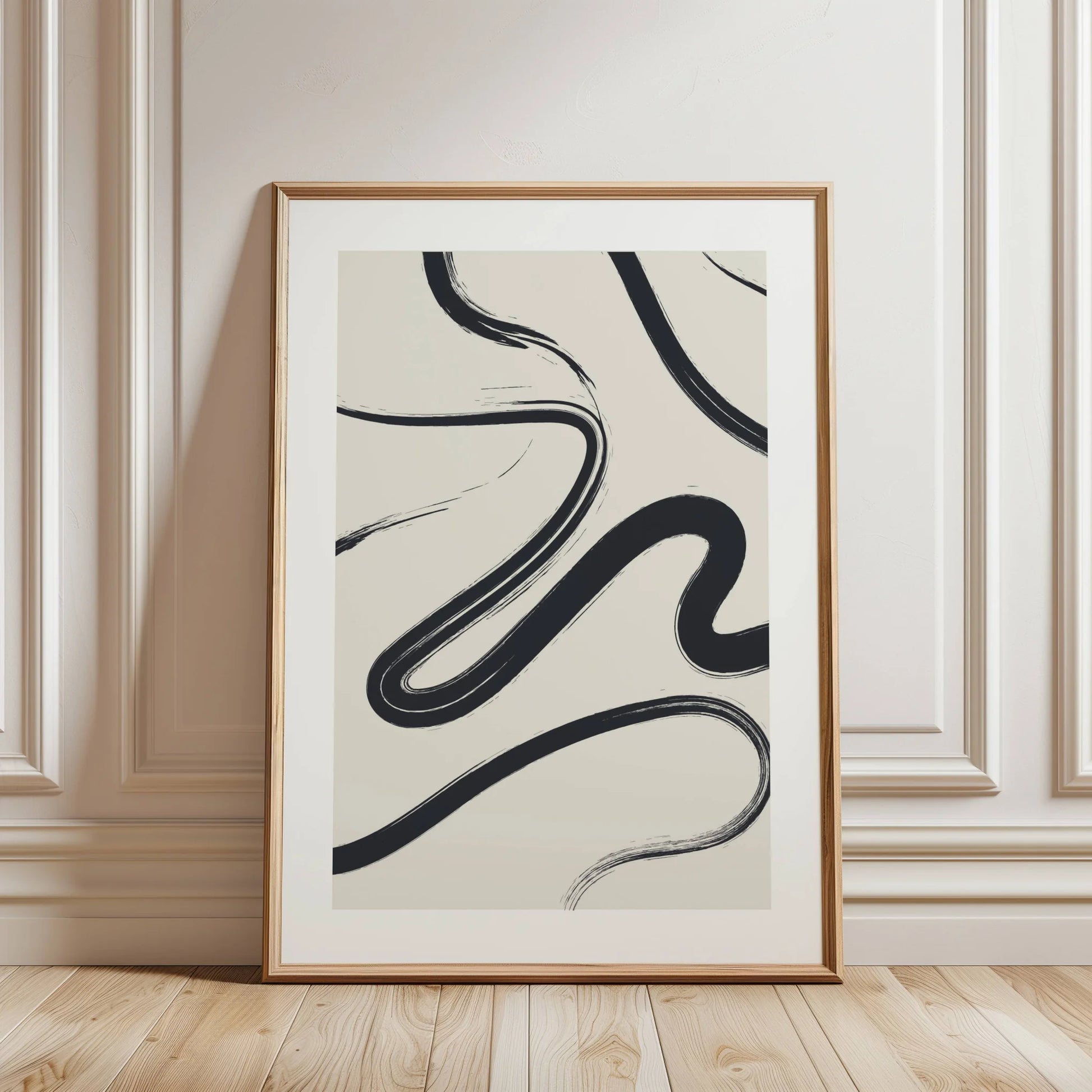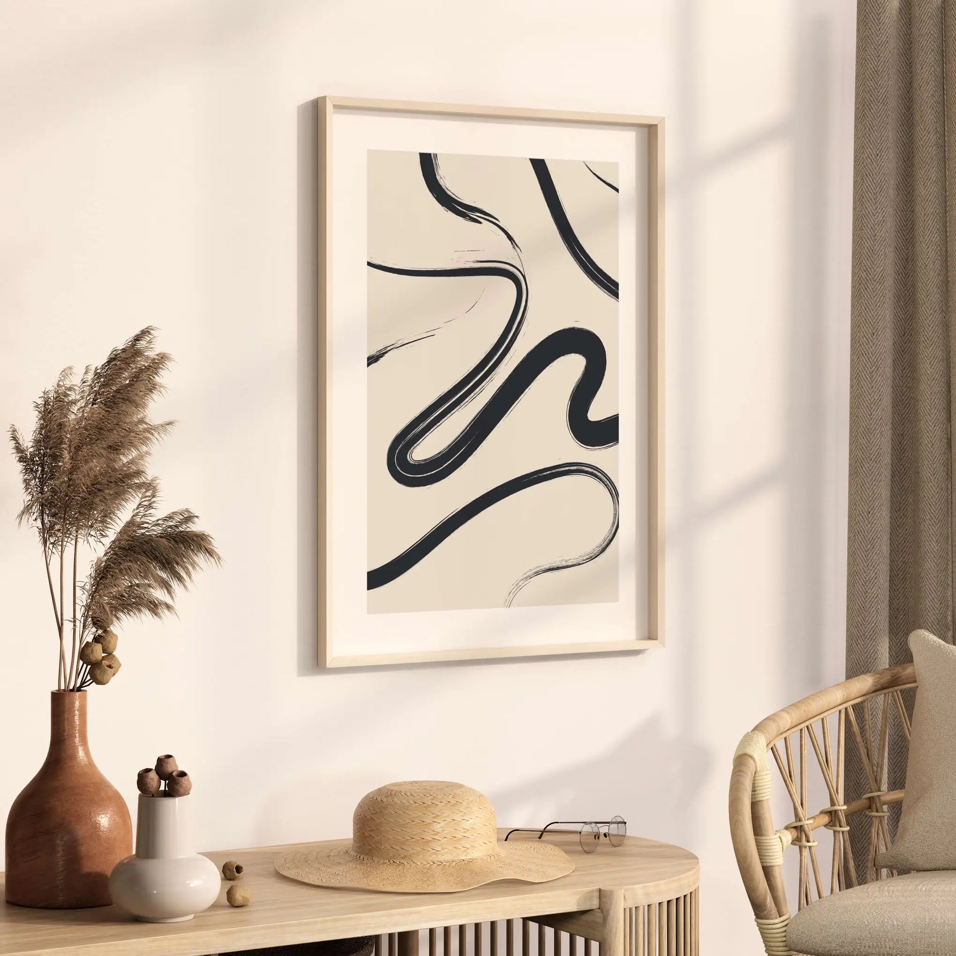 Decorative poster featuring flowing black strokes on a light beige background. The fluid lines create a simple, modern design perfect for minimalist spaces.