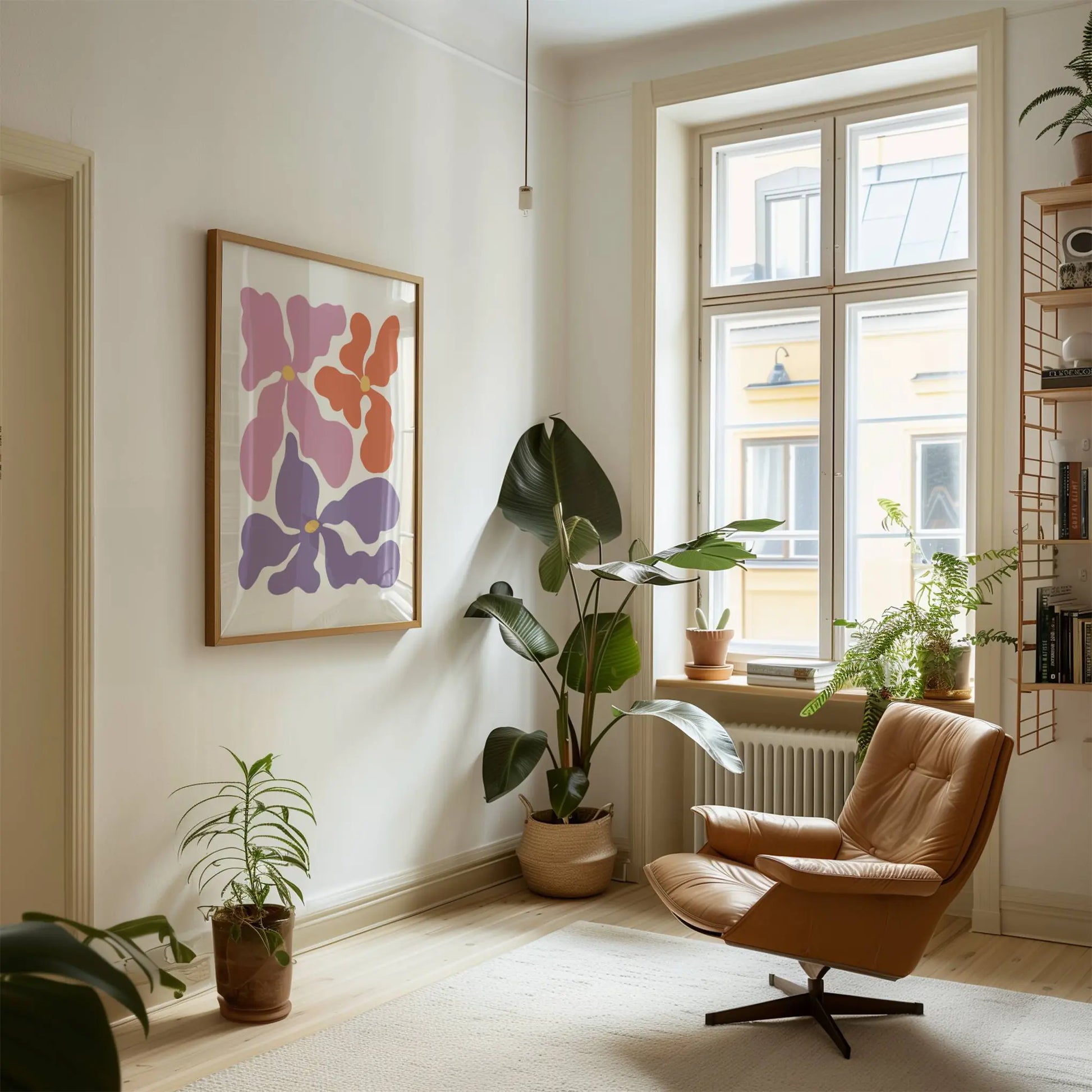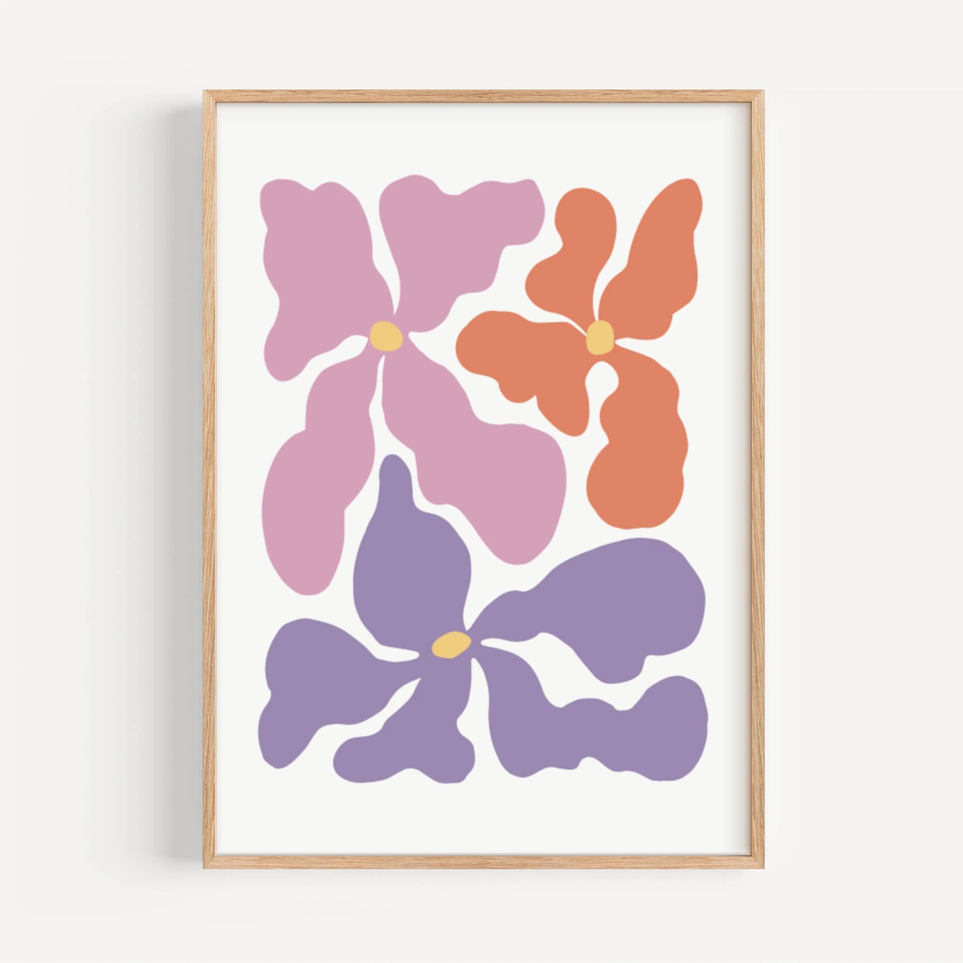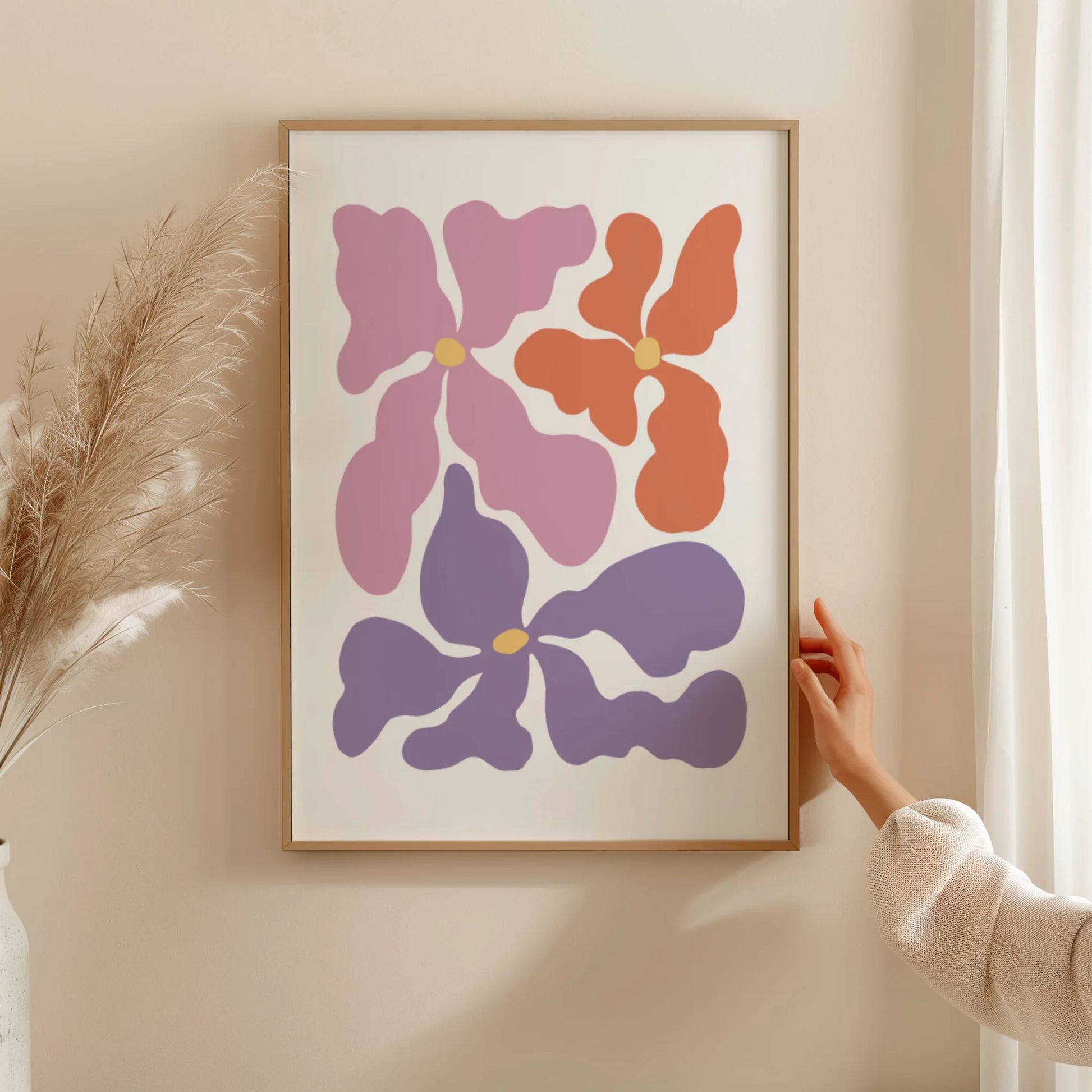 Decorative abstract flowers poster in bright colors. Features three simple flowers in pink, orange, and purple on a white background. Perfect for adding a pop of color to your living room or bedroom.