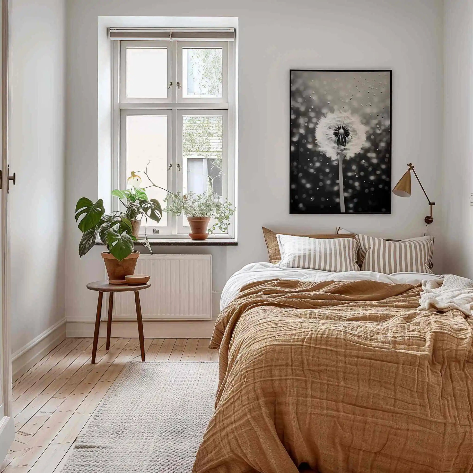 Black and white dandelion poster with dreamy water droplets. This elegant wall art brings a serene, sophisticated touch to any space.