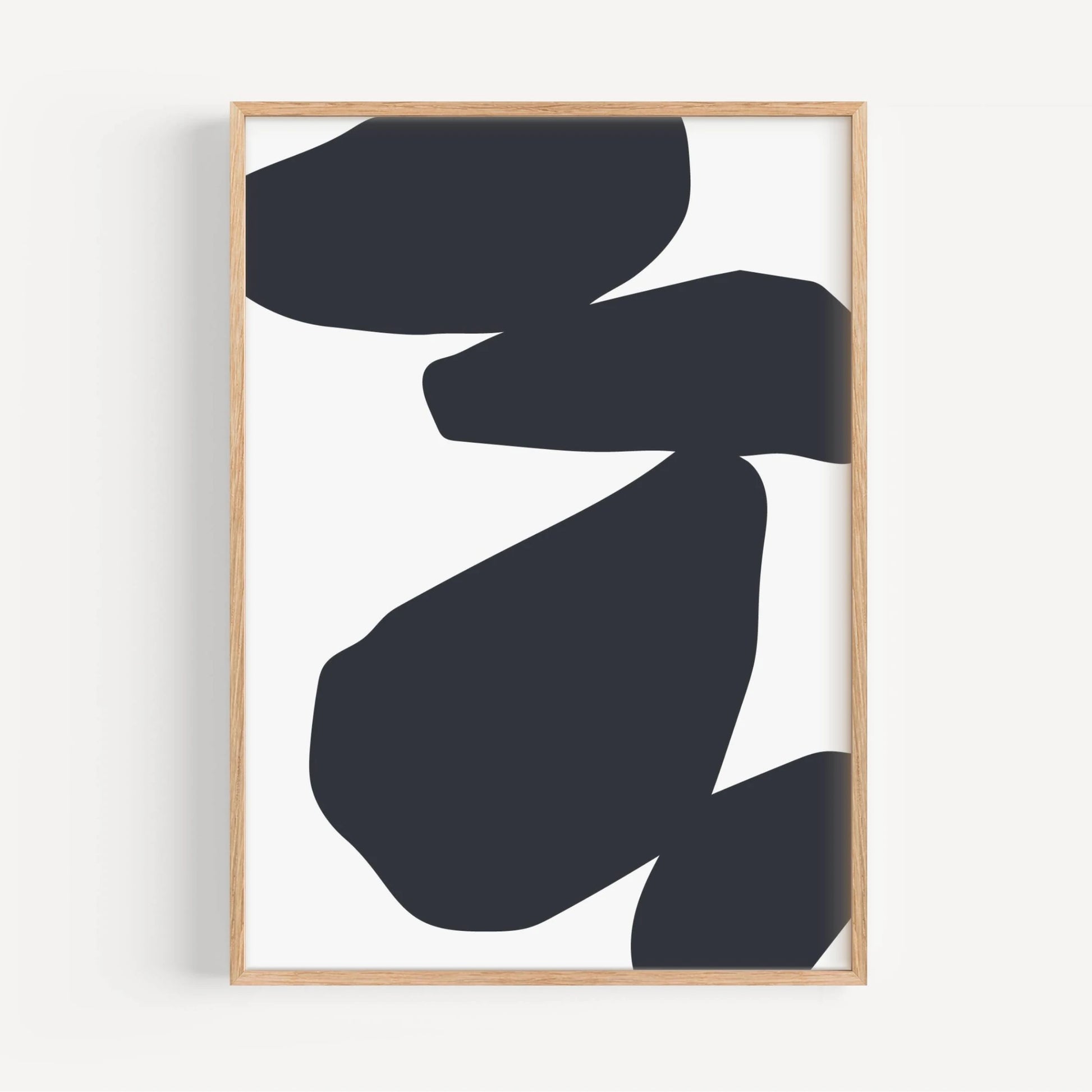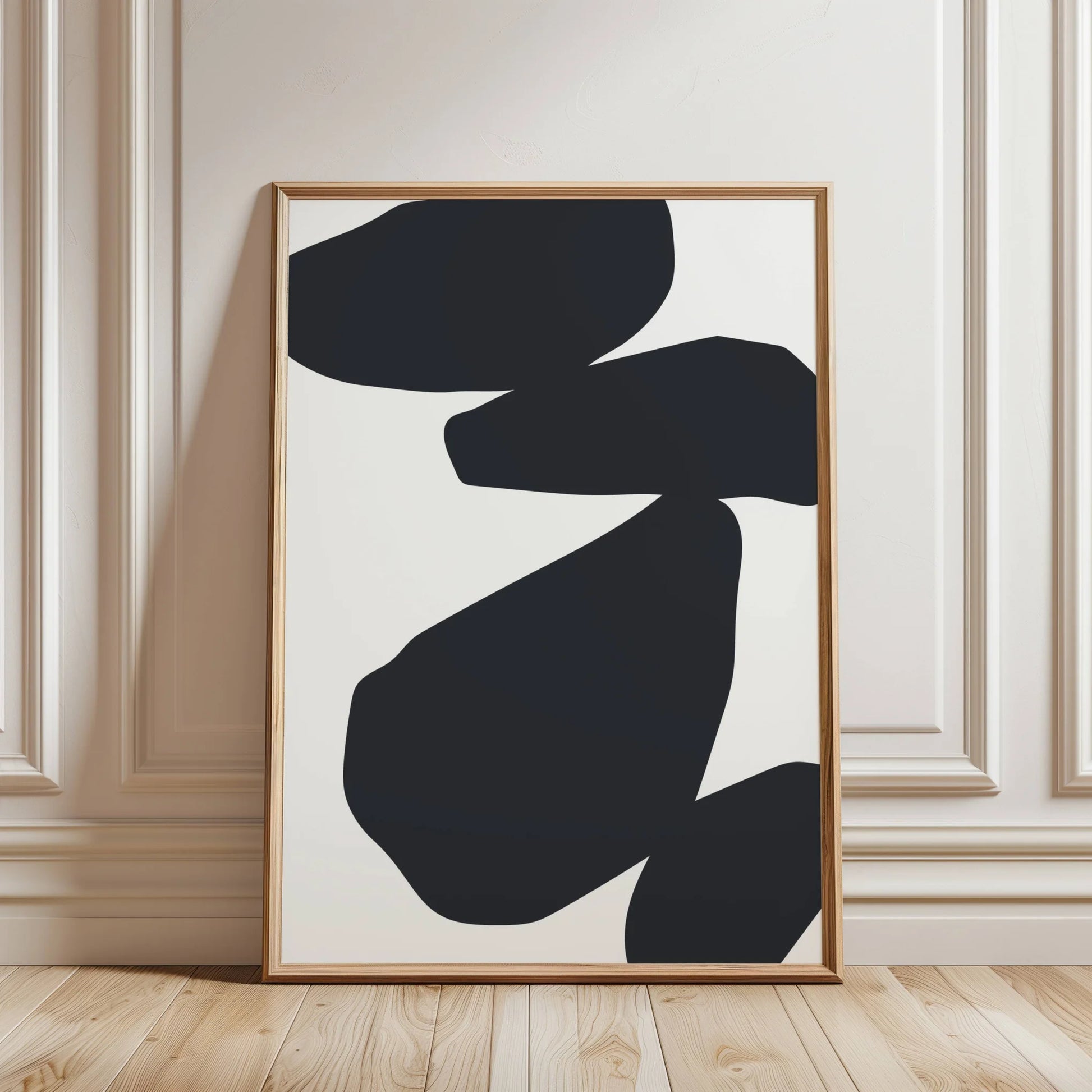 Minimalist decorative poster featuring abstract black shapes on a white background. Clean design with organic forms creating striking contrast. Perfect for modern living rooms and bedrooms.