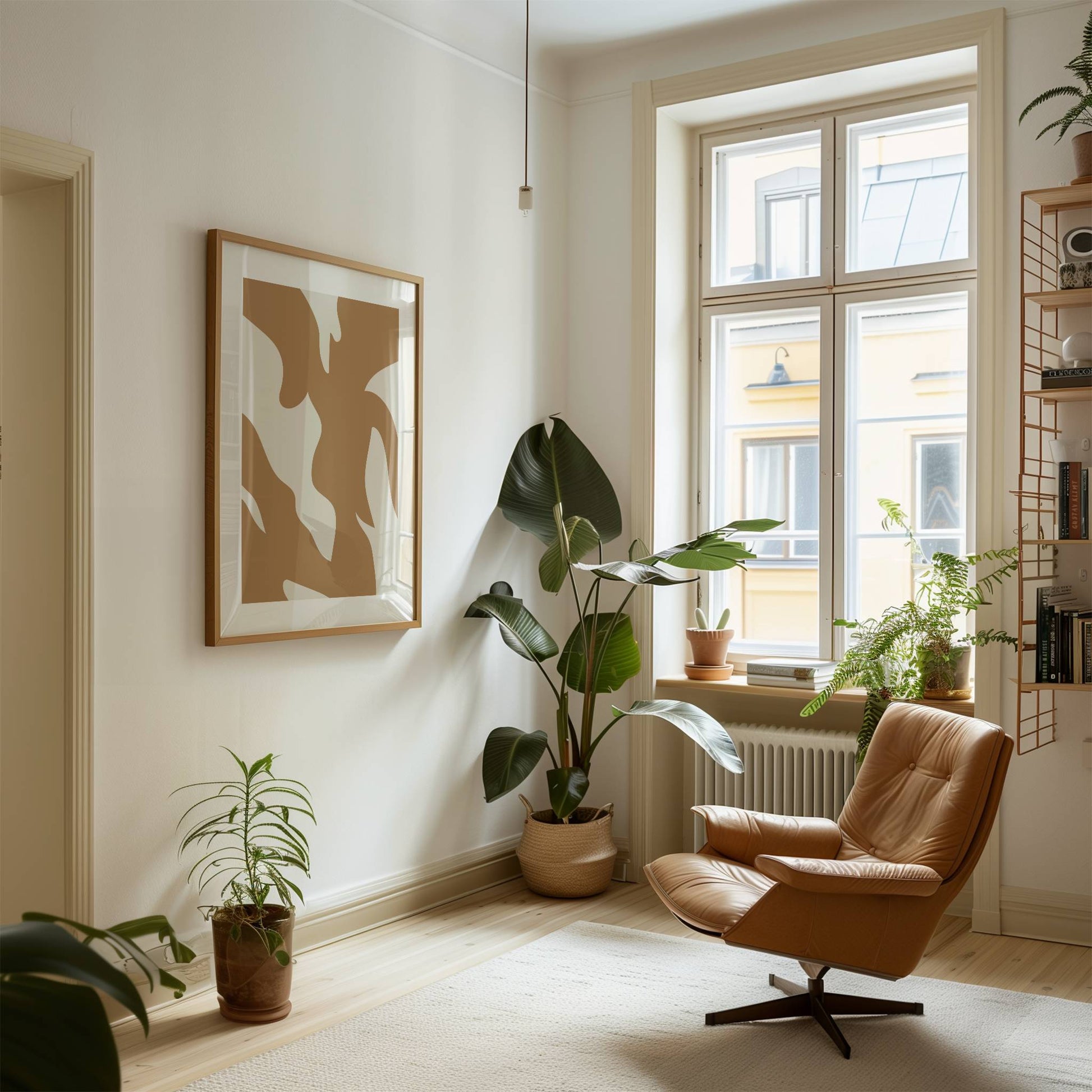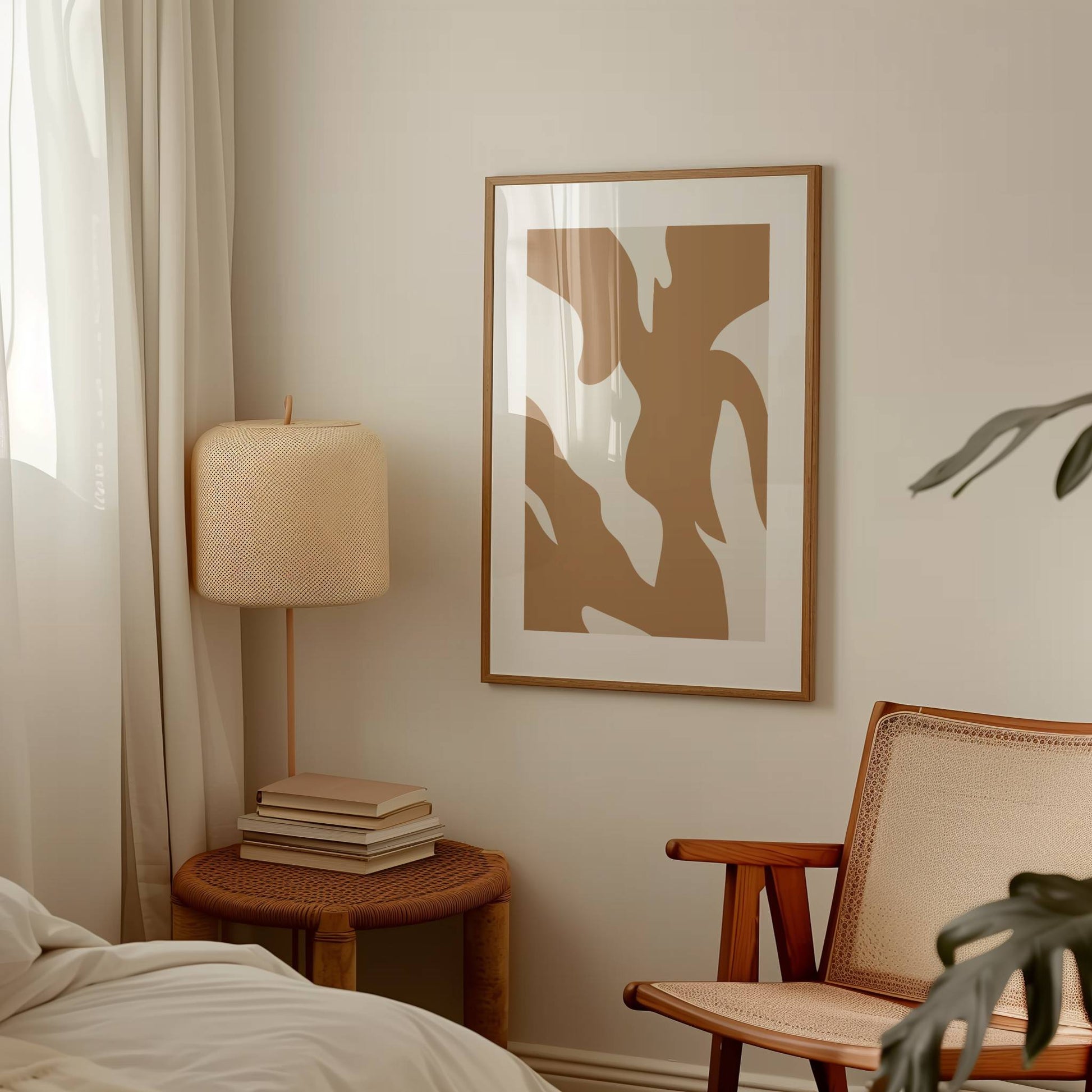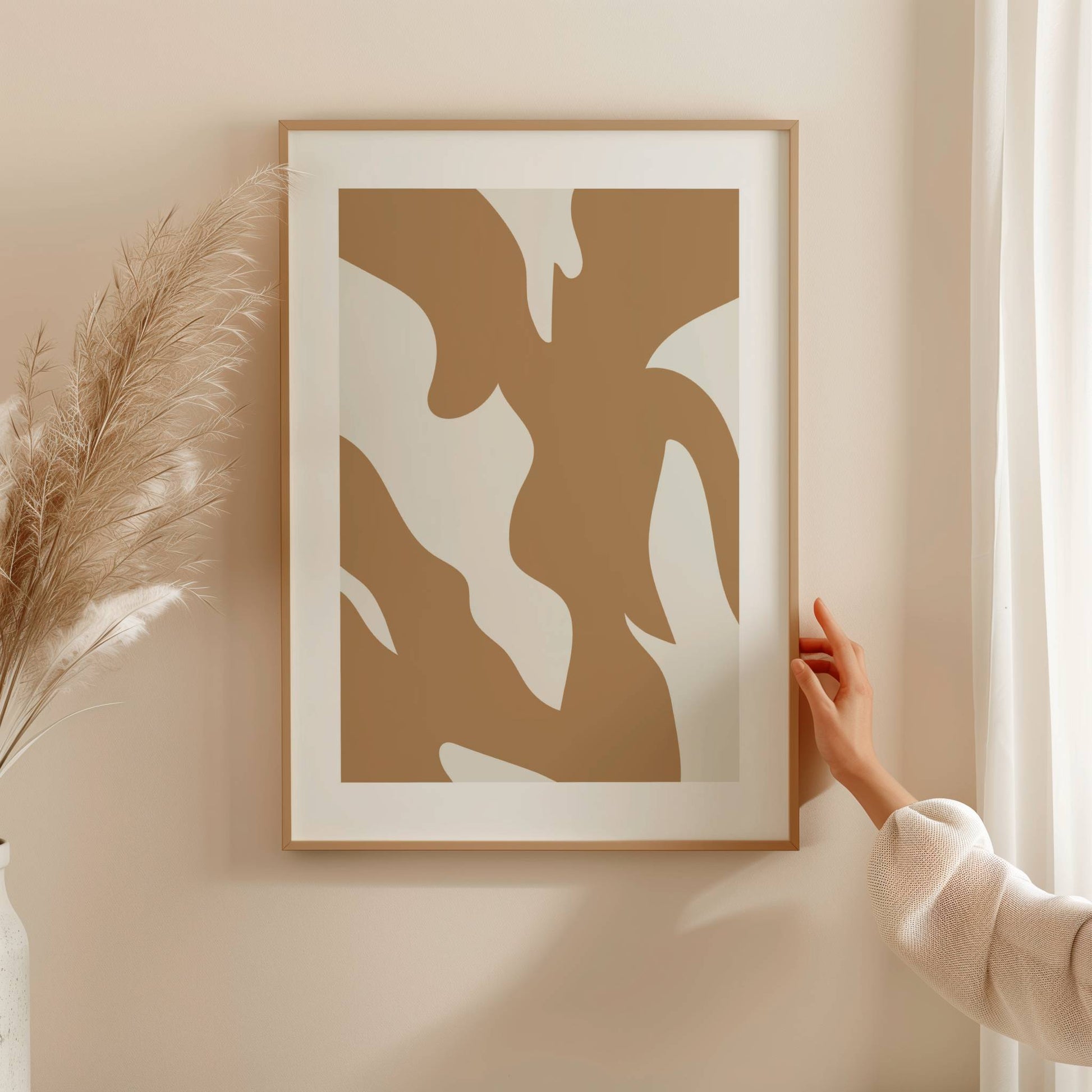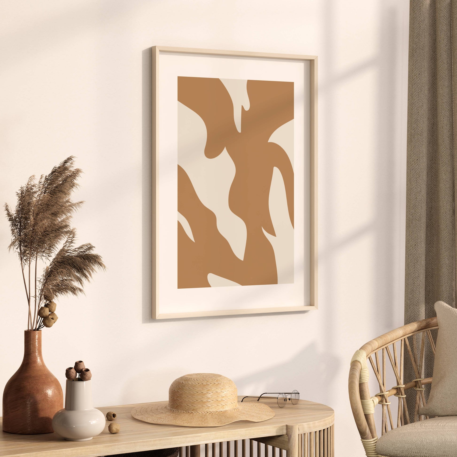 Beautiful decorative poster featuring organic shapes in brown and beige tones. Abstract design with smooth curves reminiscent of desert landscapes. Perfect for living rooms and bedrooms.