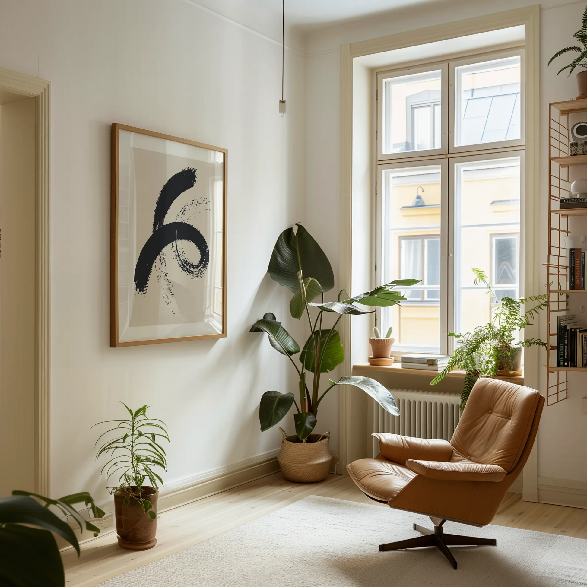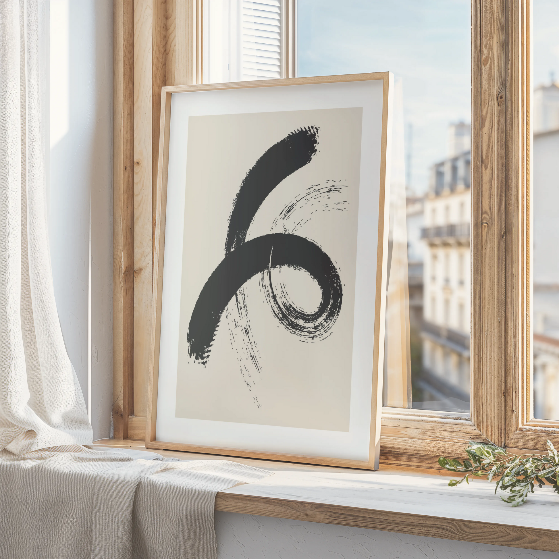 Minimalist decorative poster featuring a simple black curved stroke on a beige background. The brushstroke creates a simple yet expressive shape that gives a sense of movement. Perfect for modern and minimalist spaces.