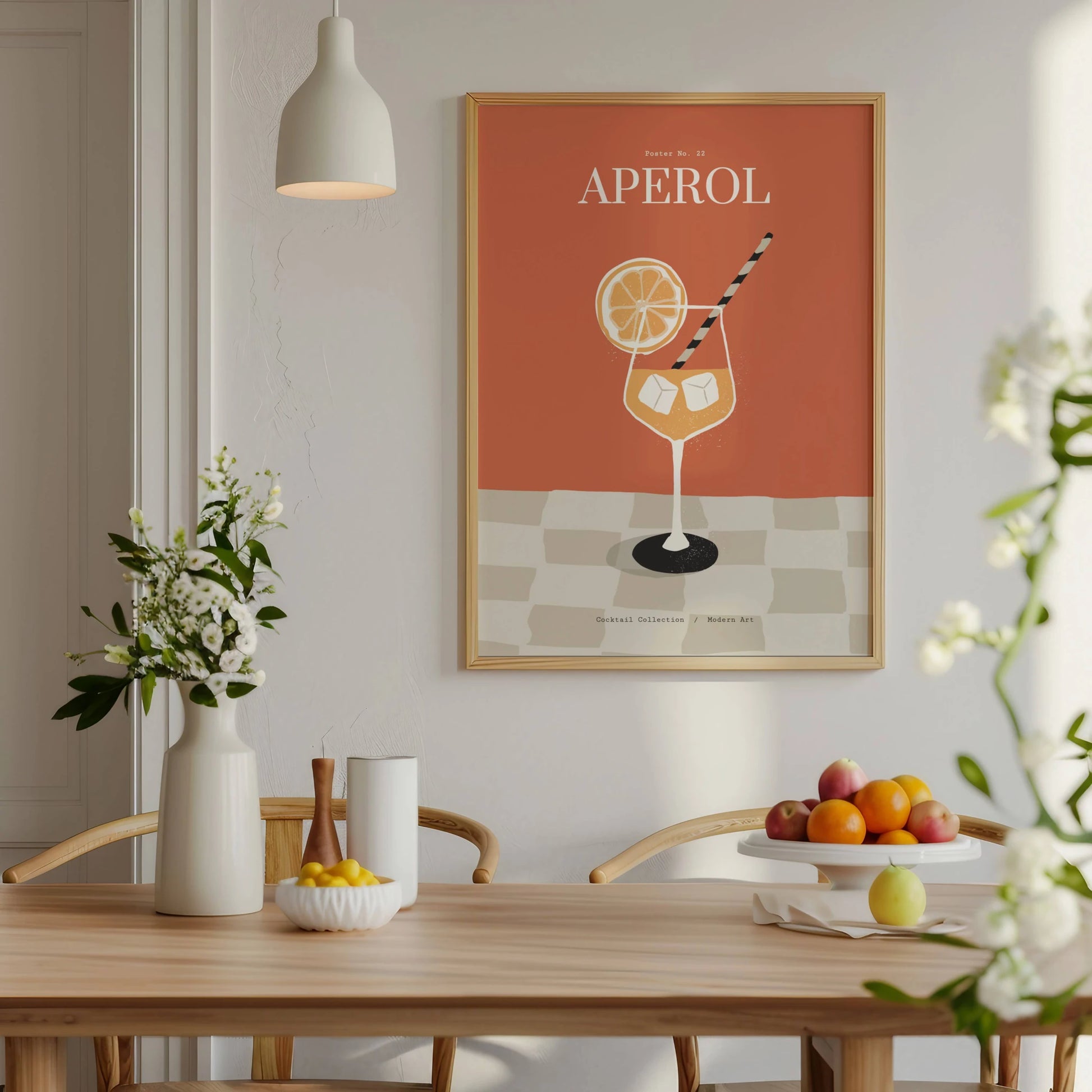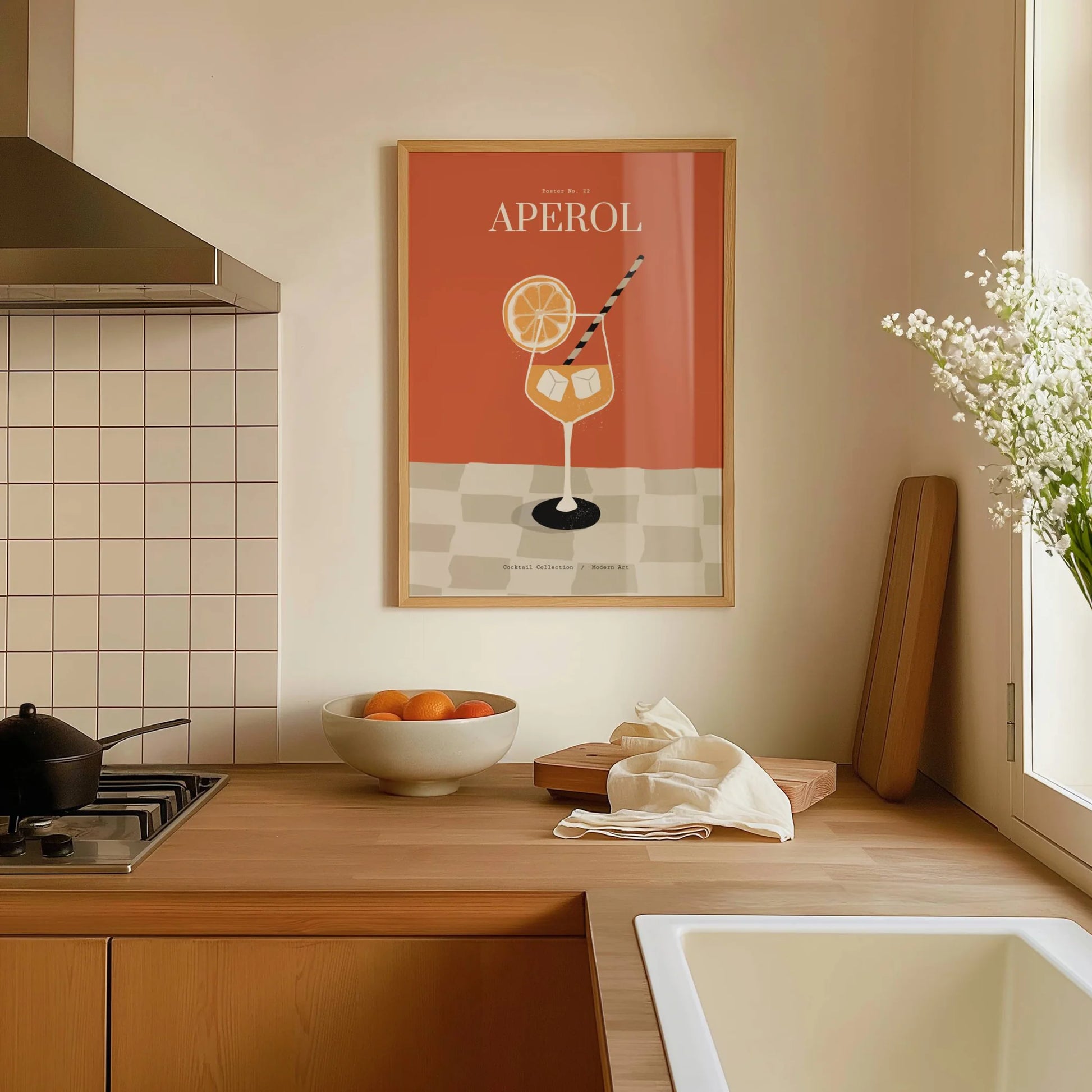 Coqueta lámina decorativa de cóctel Aperol con rodaja de naranja y cubitos de hielo. Fondo naranja vibrante y diseño refrescante. Perfecta para la cocina o salón.