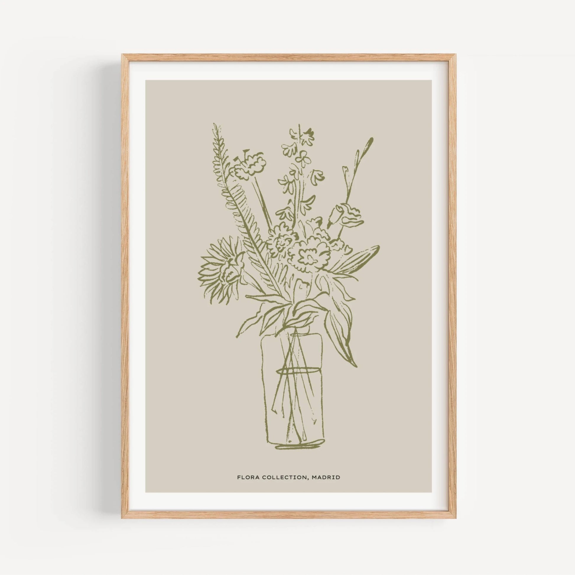 Lámina decorativa de flores en un vaso. Dibujo sencillo en color verde sobre fondo beige claro. Ideal para el salón o dormitorio.