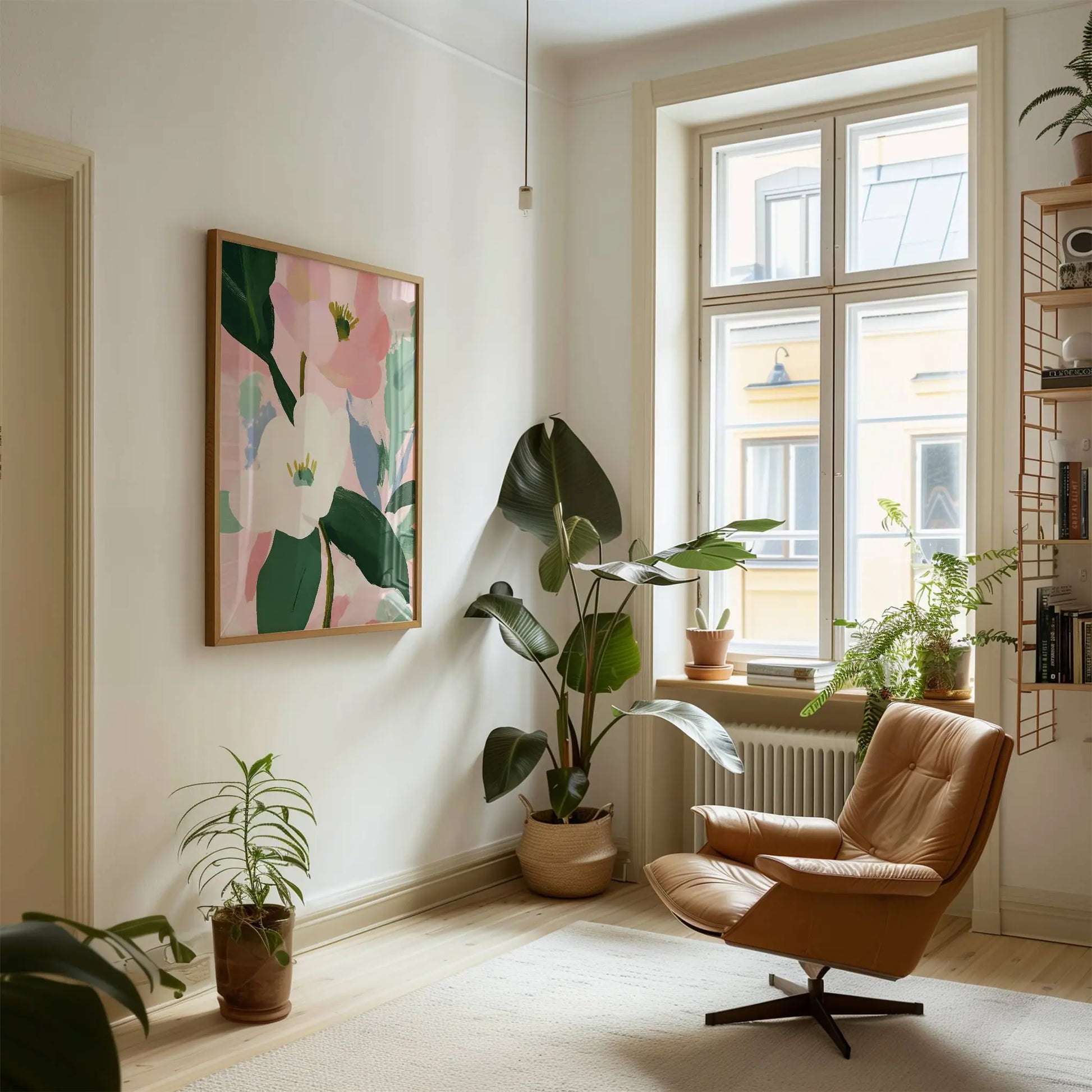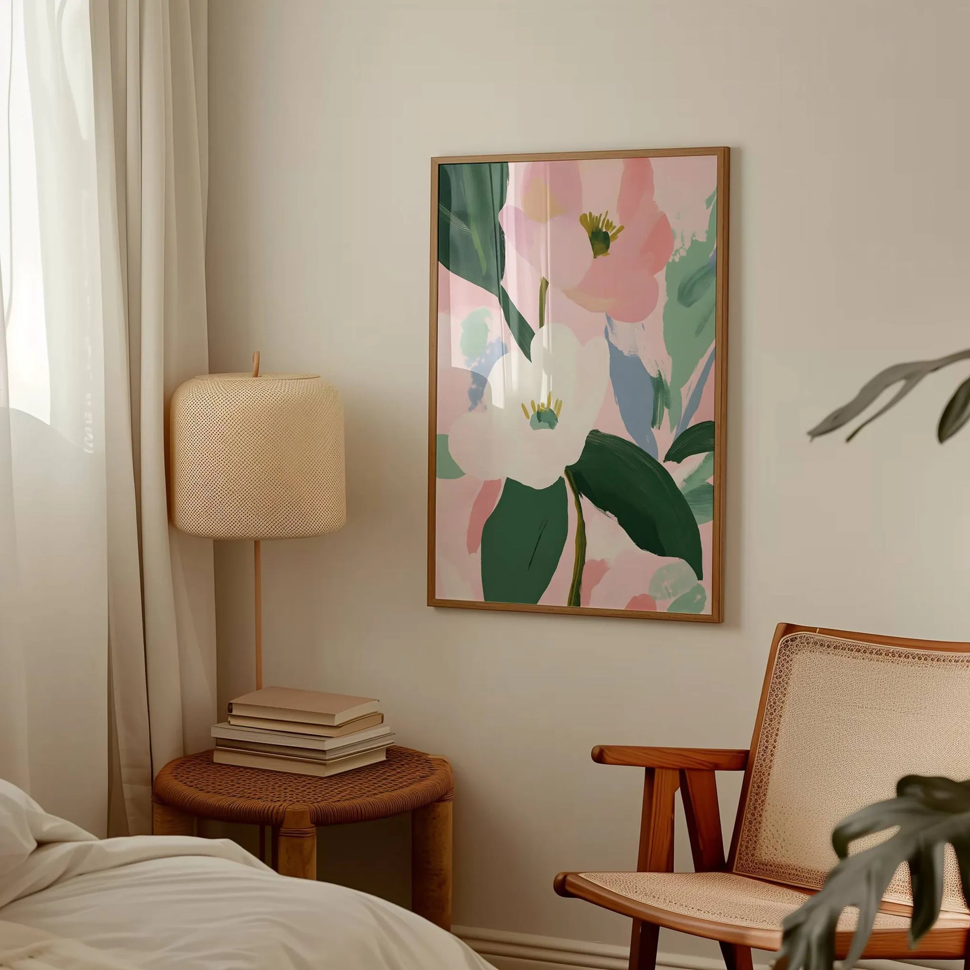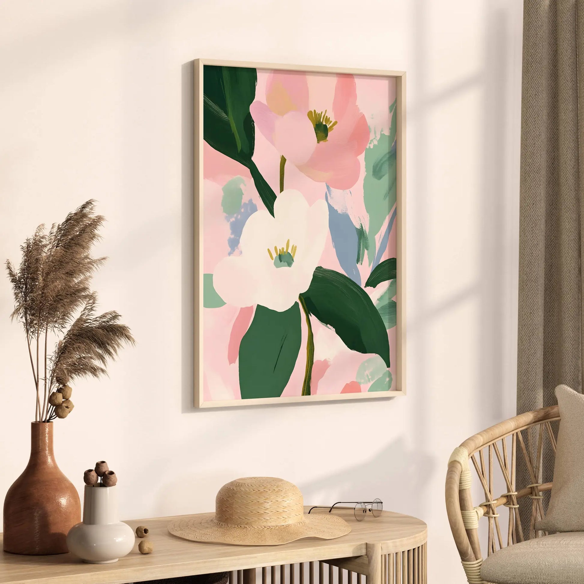 Ilustración de flores en blanco y rosa. Composición delicada en tonos pasteles que evoca un estilo artístico clásico. Ideal para dormitorios y salones.