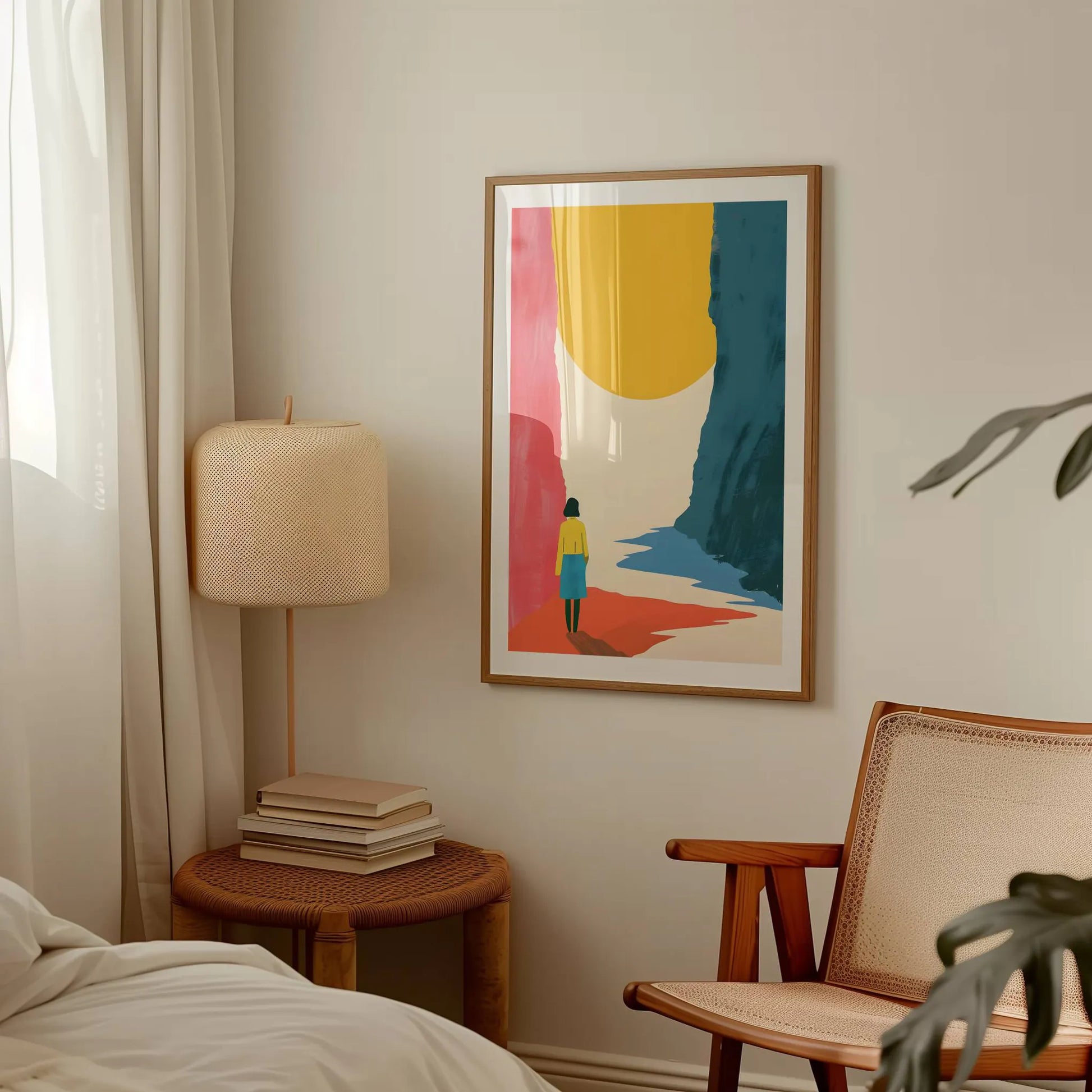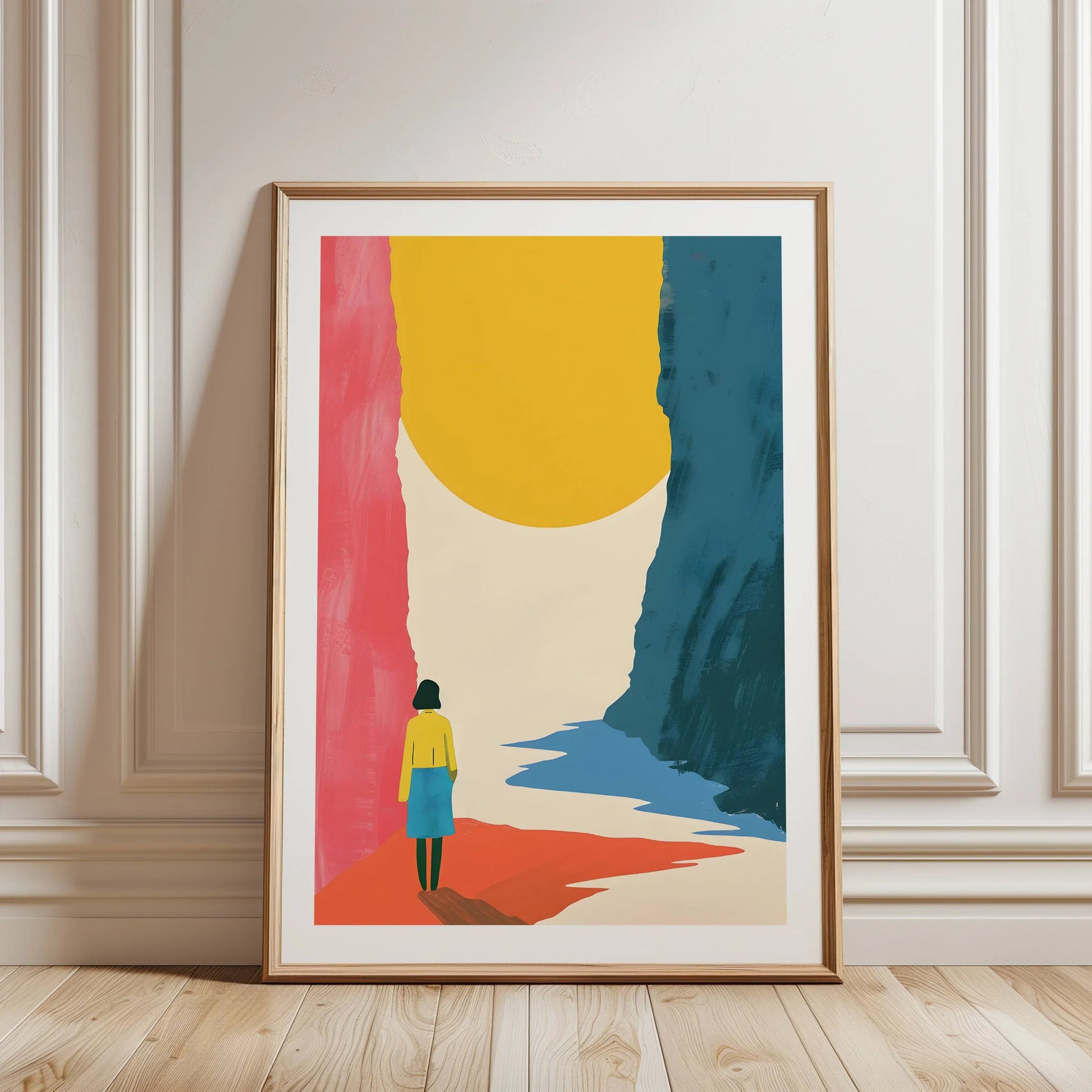 Ilustración minimalista de una mujer contemplando un paisaje abstracto de tonos rosados y azules, y una gran esfera amarilla brillante en el fondo, creando una escena surrealista y contemplativa.