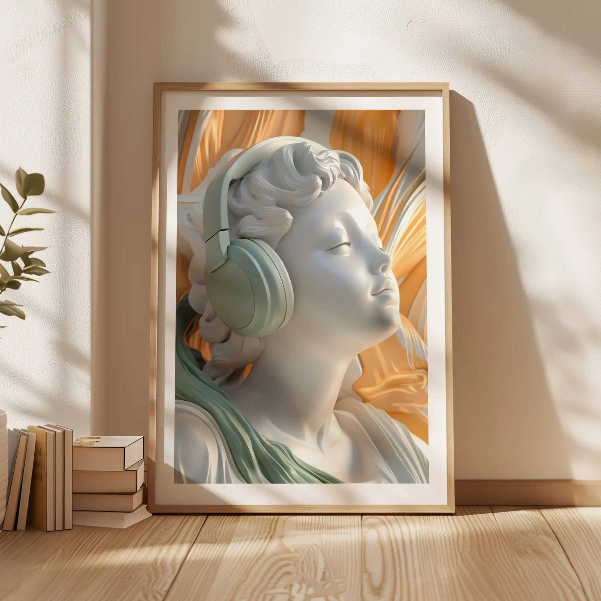 Lámina decorativa de ángel con cascos, escuchando música celestial. Hermoso y divertido diseño en colores verde, dorado y mármol. La lámina incluye un borde blanco. Diseño ideal para decorar habitaciones juveniles.