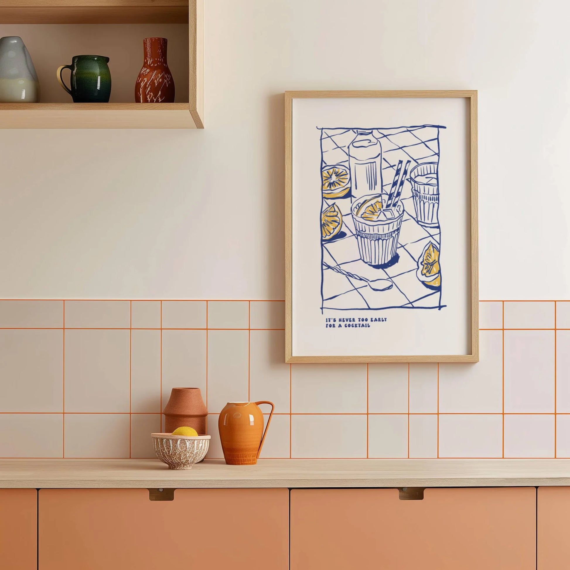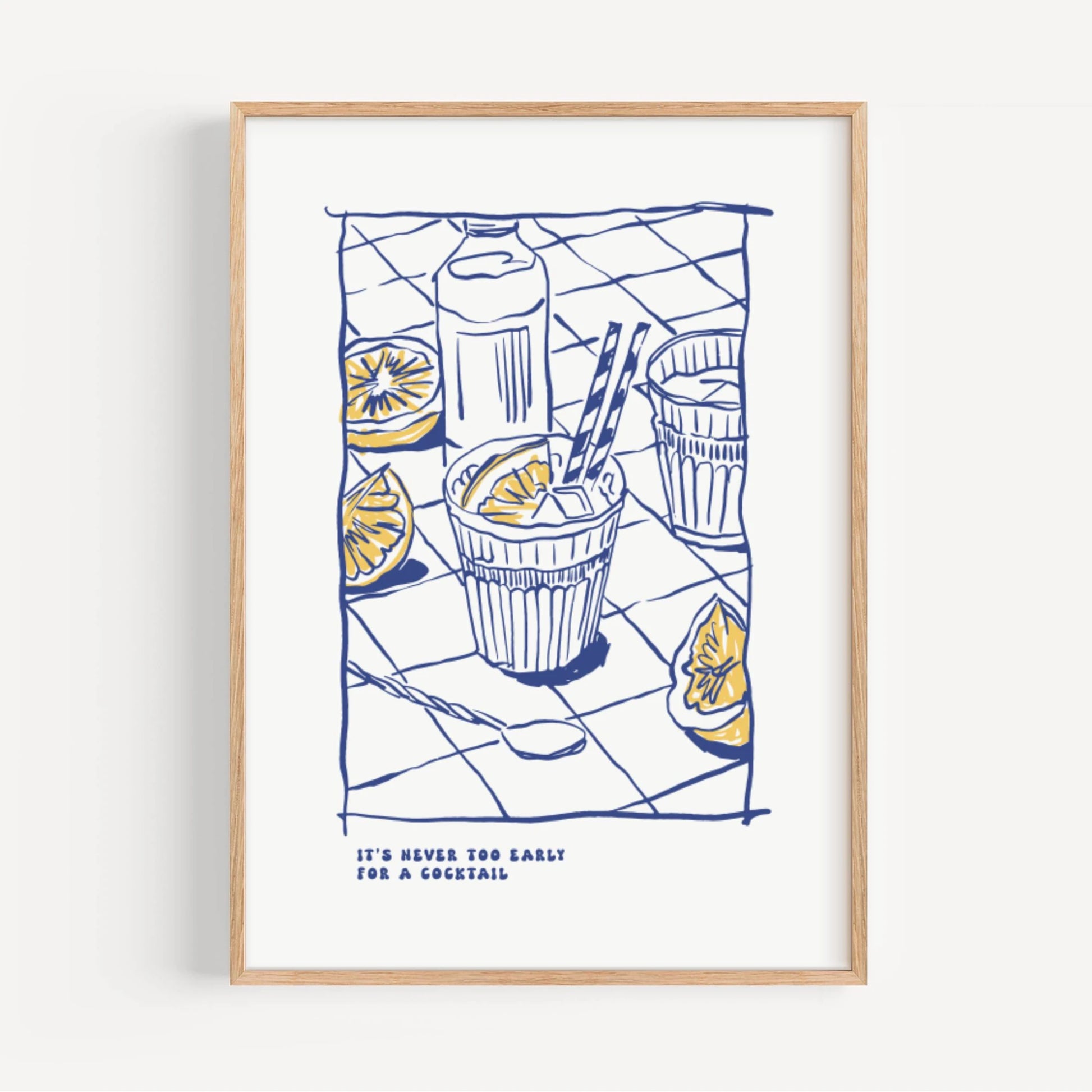 Lámina decorativa de un cóctel con rodajas de limón dibujada en estilo minimalista. Trazos azules sobre fondo blanco con toques amarillos. Ideal para la cocina o salón.
