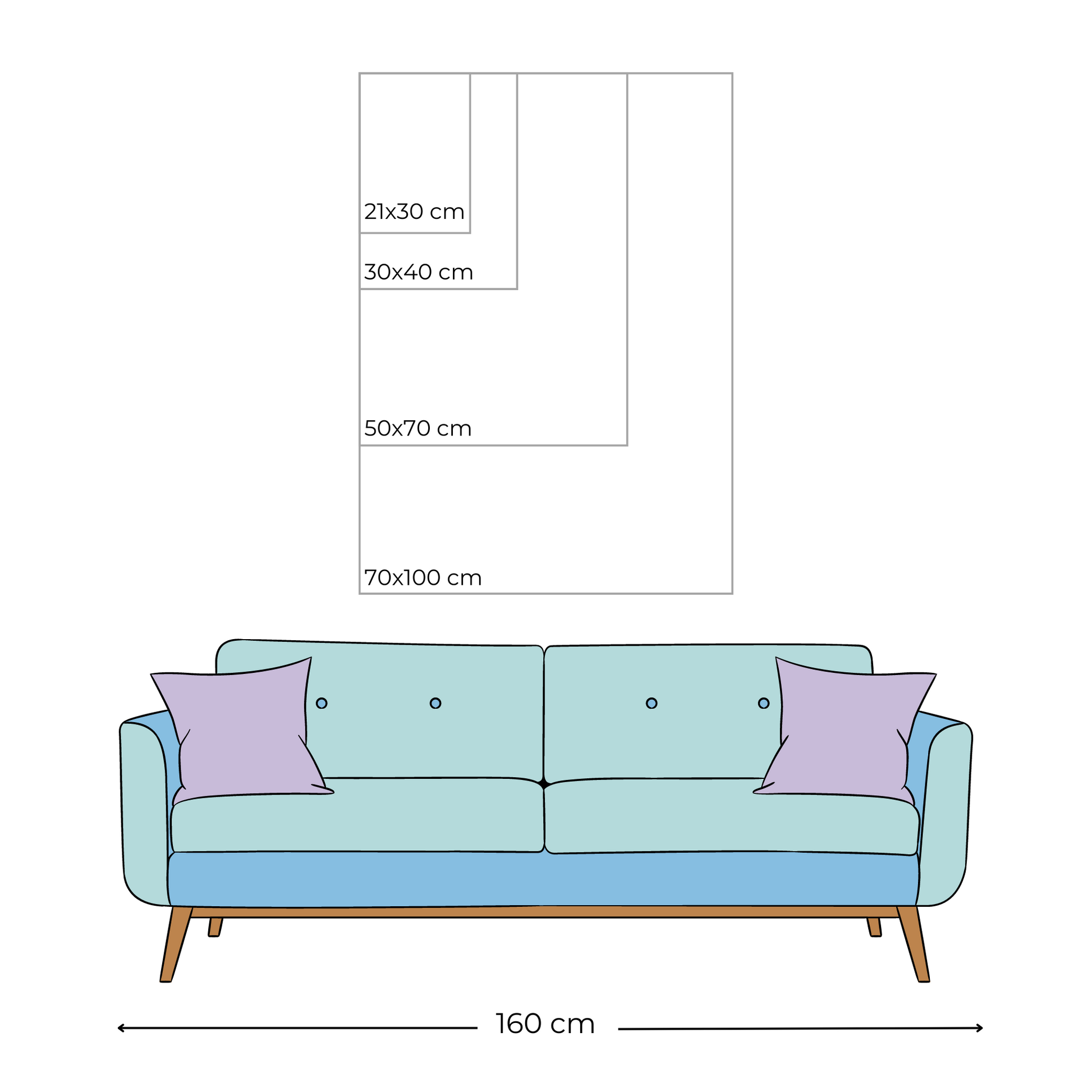 Disponible en variedad de tamaños: 21x30 cm, 30x40 cm y 50x70 cm.