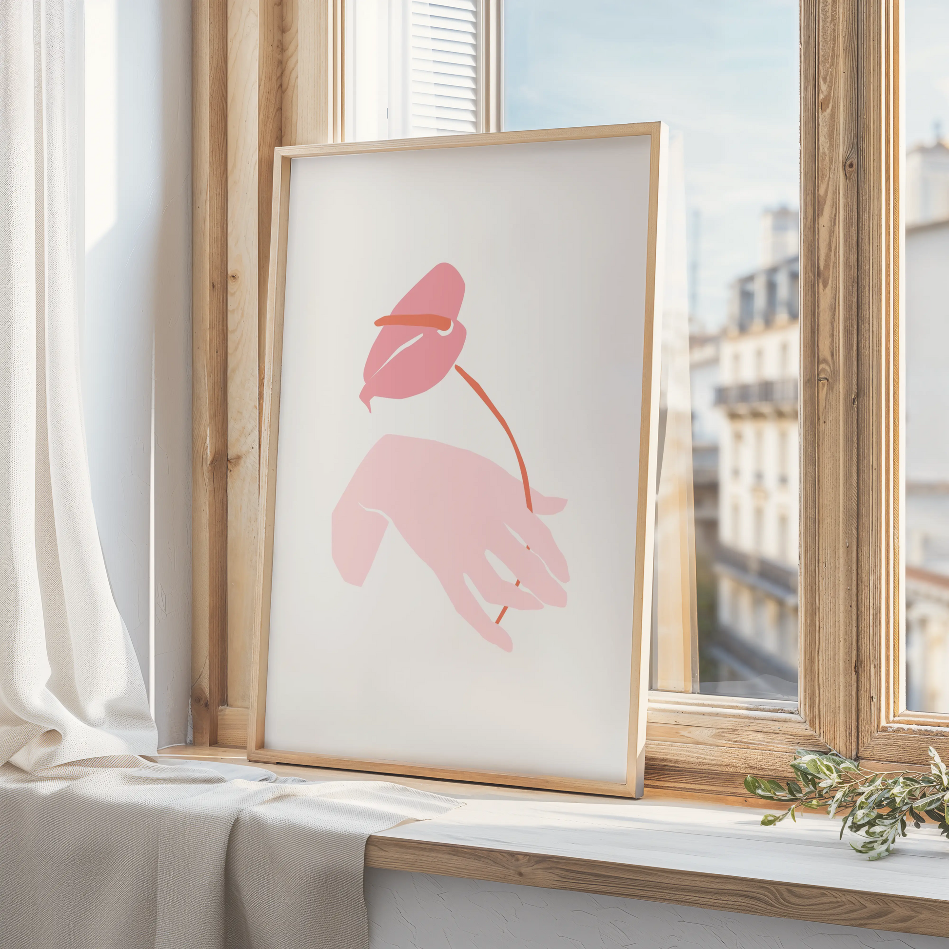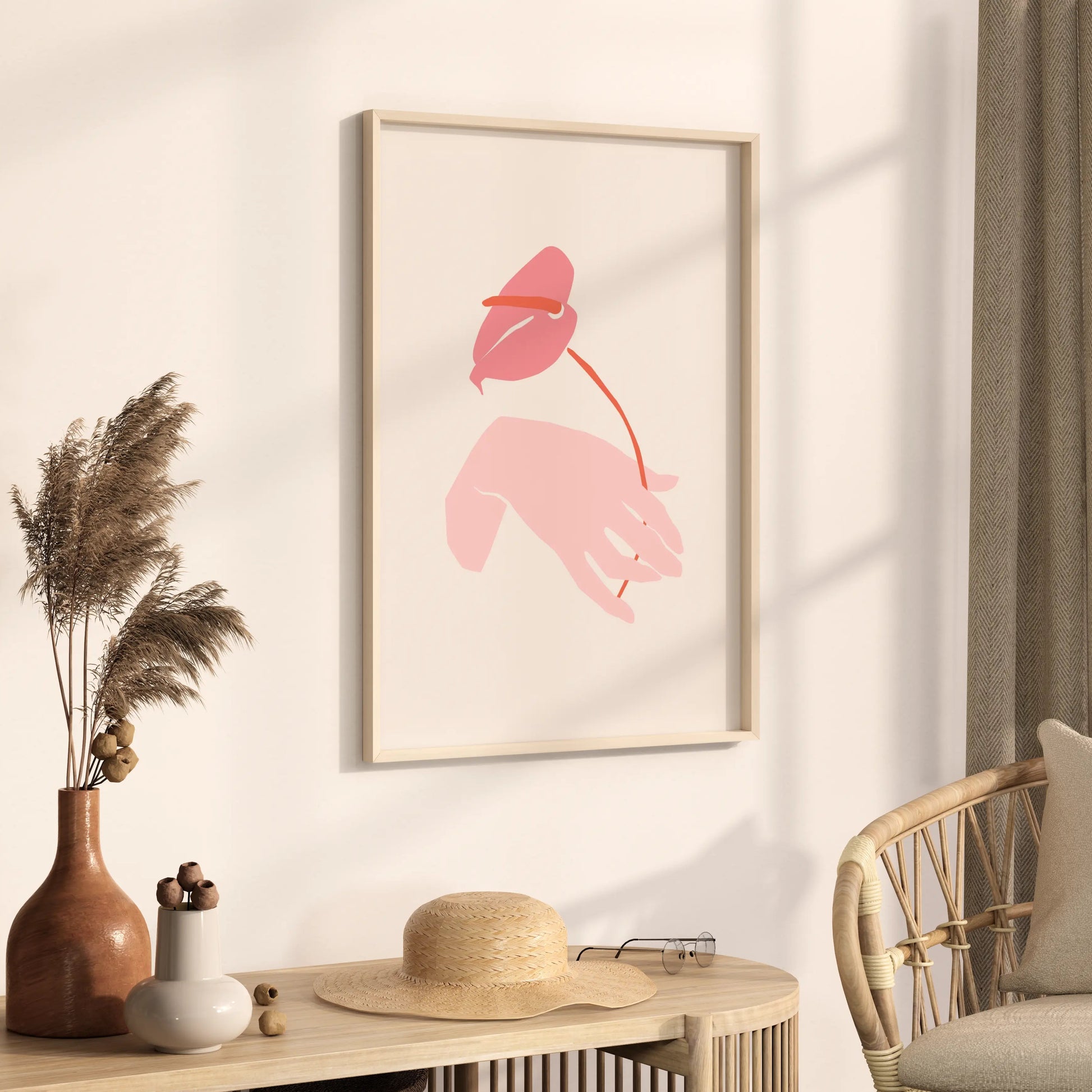 Lámina decorativa de una mano delicada sosteniendo una flor en tonos rosado. Ilustración sobre fondo blanco hueso con un estilo romántico y moderno. Perfecta para un dormitorio o salón.