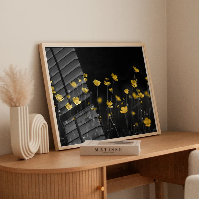 Fotografía en blanco y negro de pequeñas flores amarillas silvestres en un campo. Esta lámina da un toque sofisticado y moderno a cualquier espacio. Luce perfecta en el salón o el dormitorio.