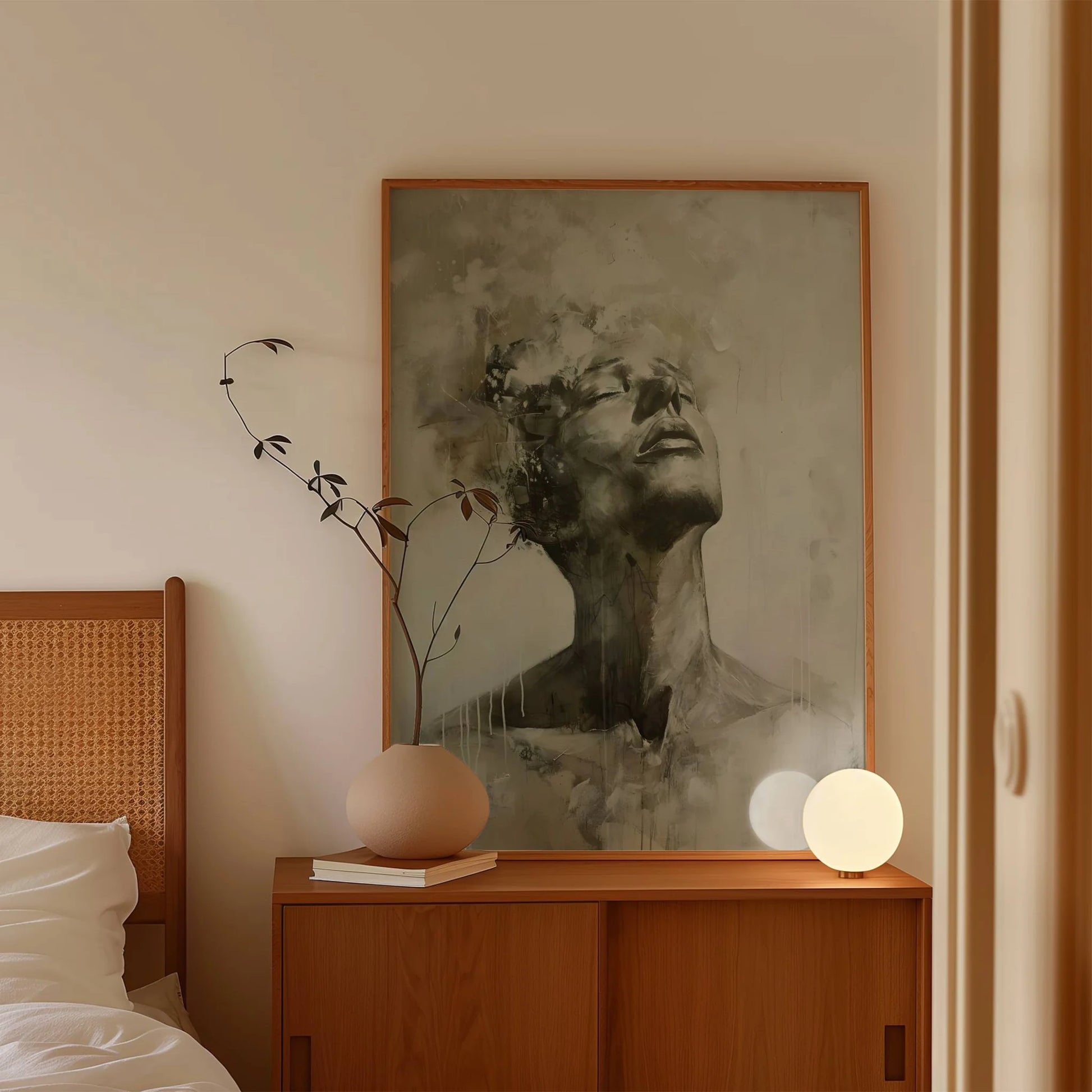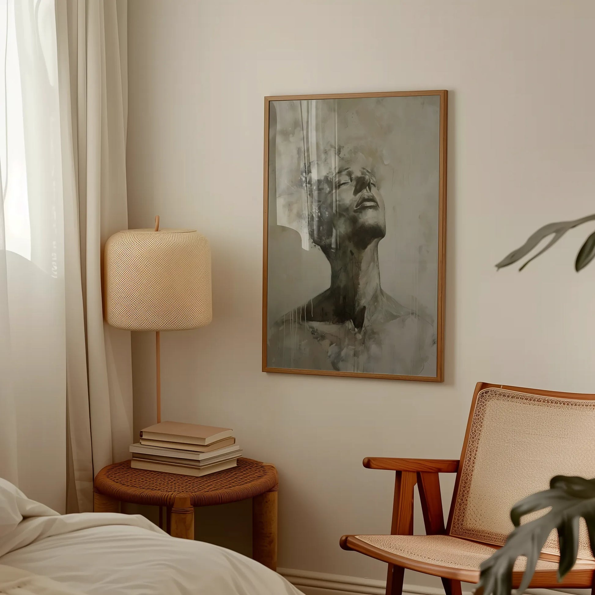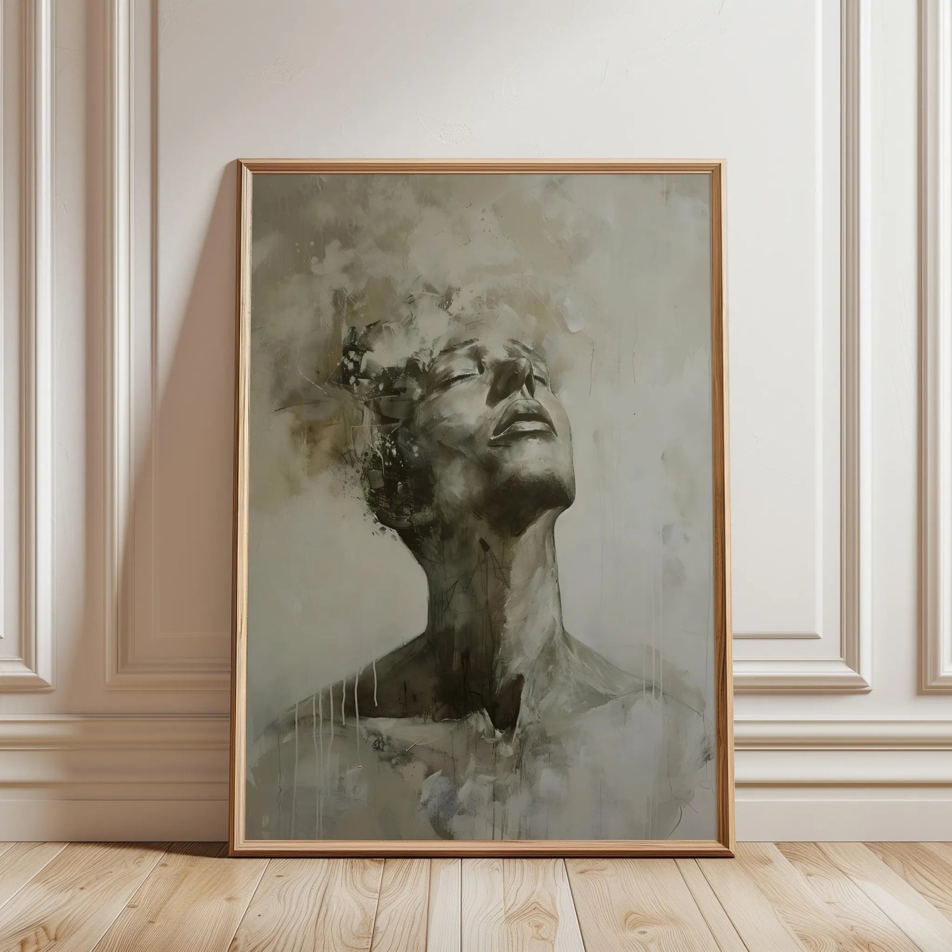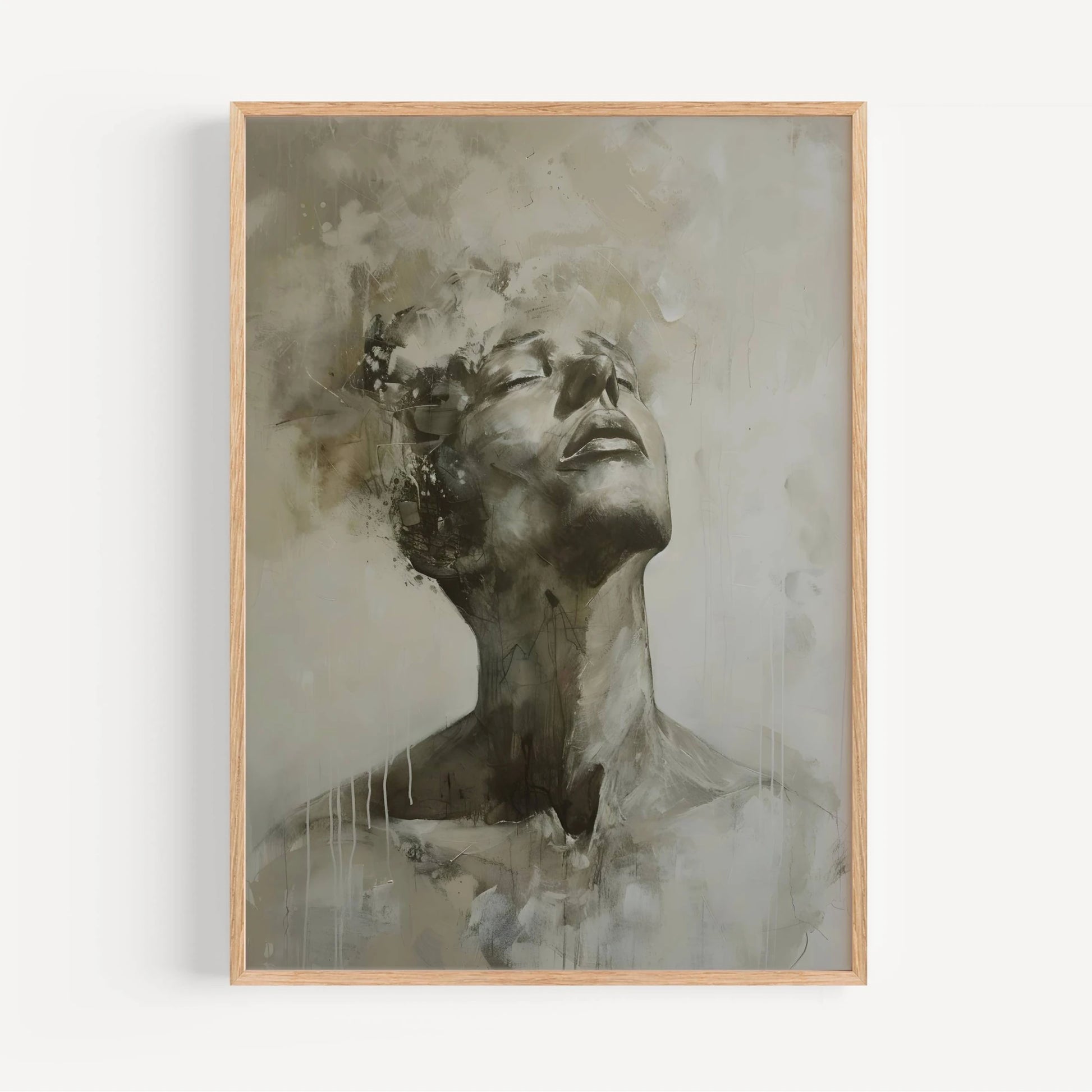 Retrato abstracto que captura un rostro en contemplación. Los trazos en tonos tierra y grises aportan textura y profundidad a esta lámina decorativa. Ideal para ambientes modernos.
