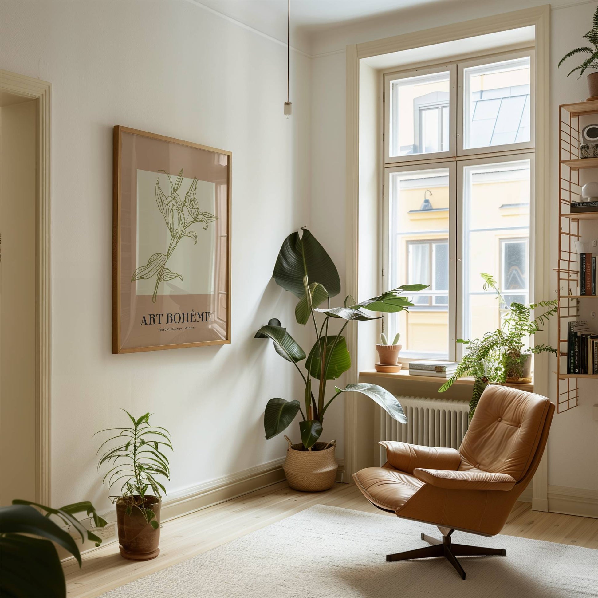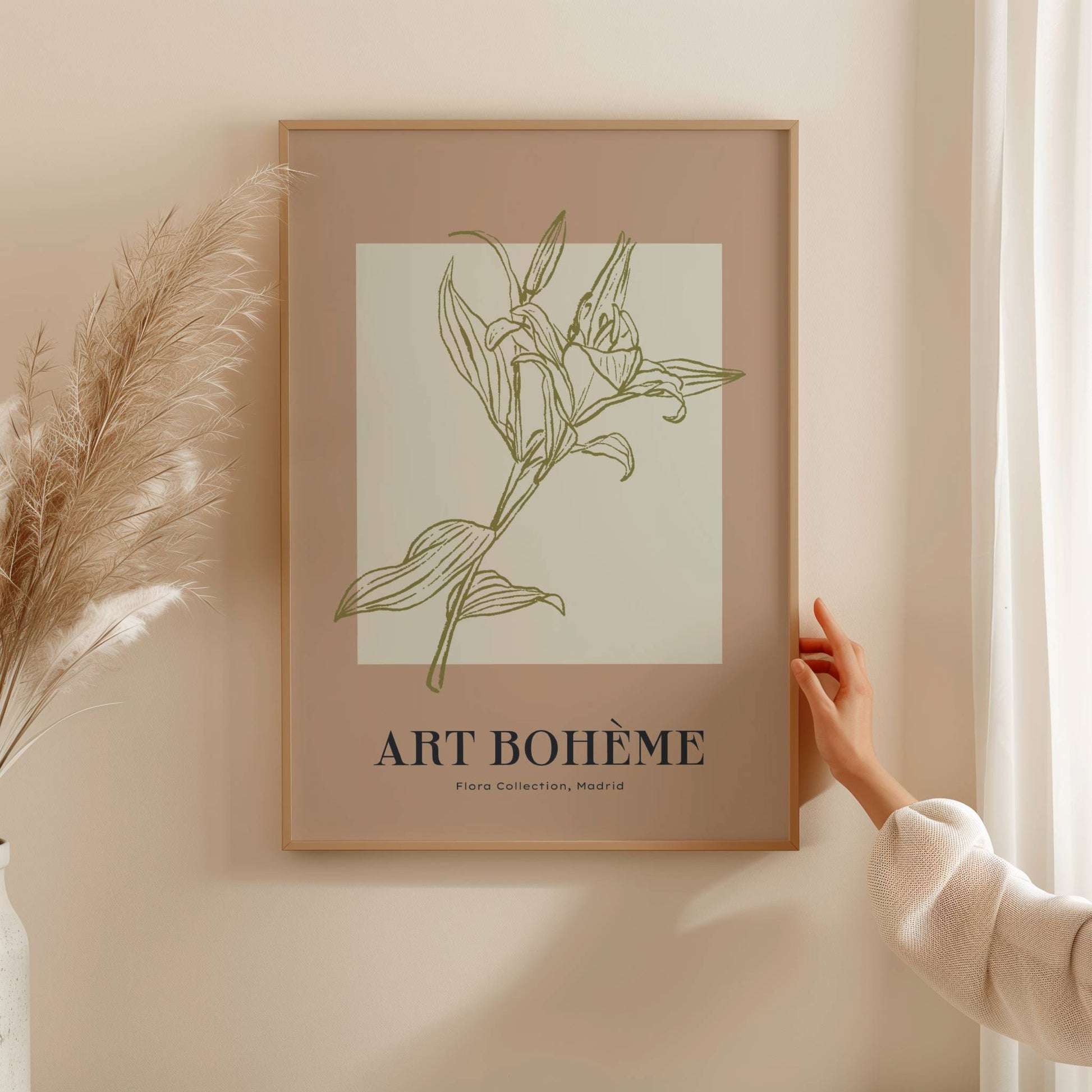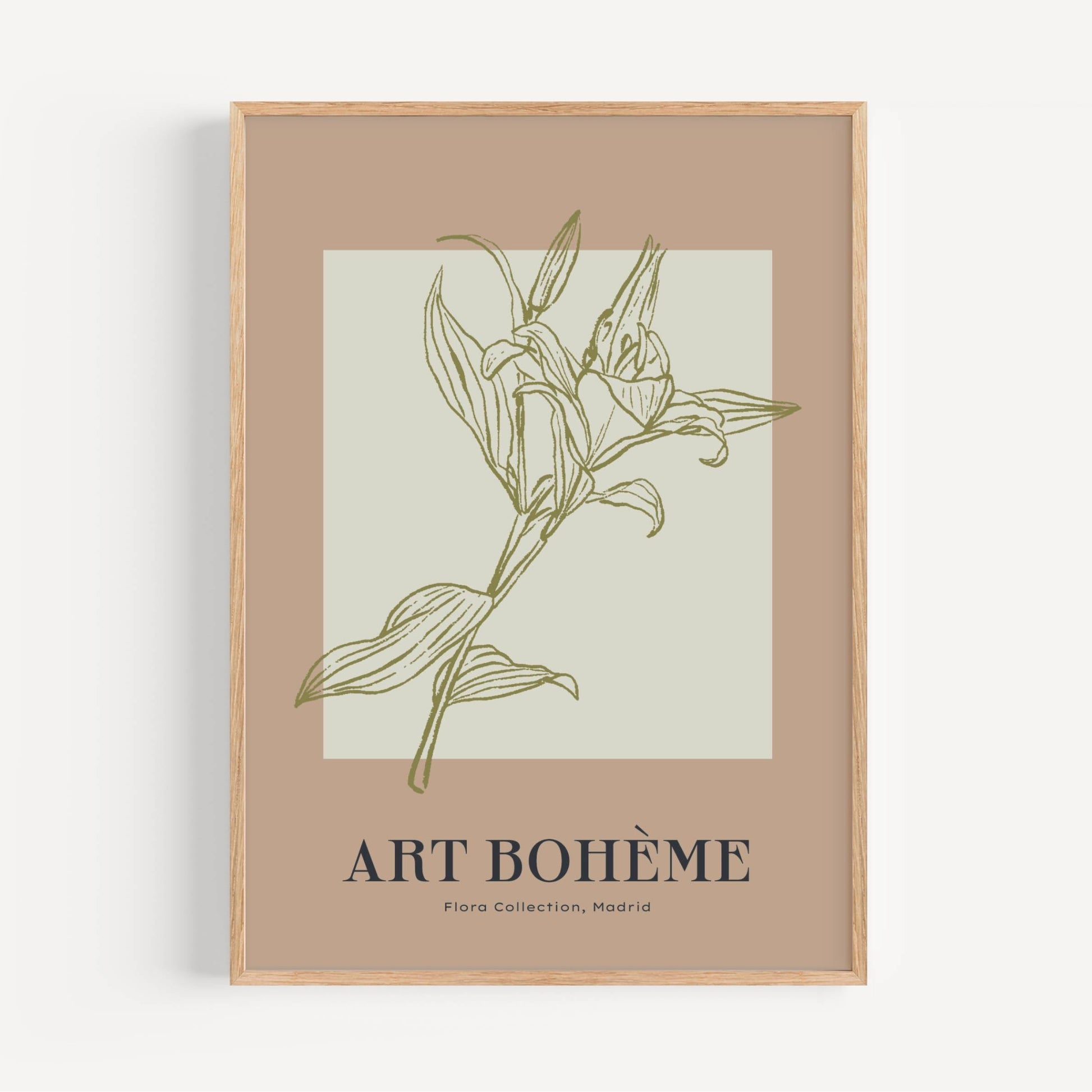 Lámina decorativa de un lirio dibujado con líneas verdes sobre fondo beige suave. Muestra una flor con estilo minimalista y elegante que queda perfecta en espacios tranquilos.