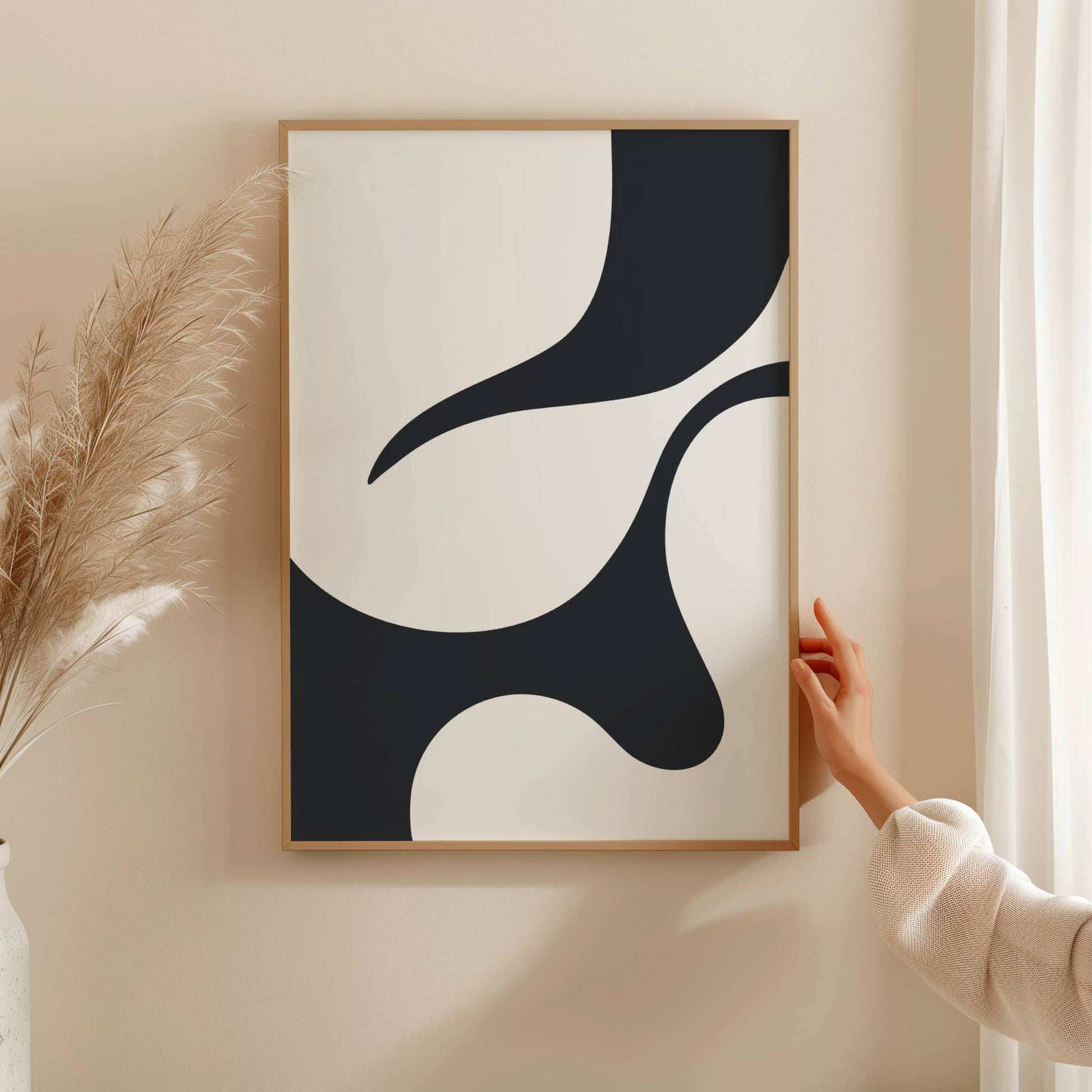 Lámina decorativa con formas curvas en blanco y negro. Diseño minimalista con contrastes fuertes que aporta un toque moderno. Perfecta para el salón o dormitorio.