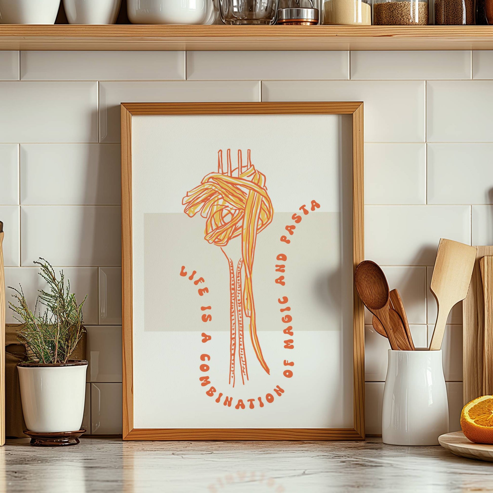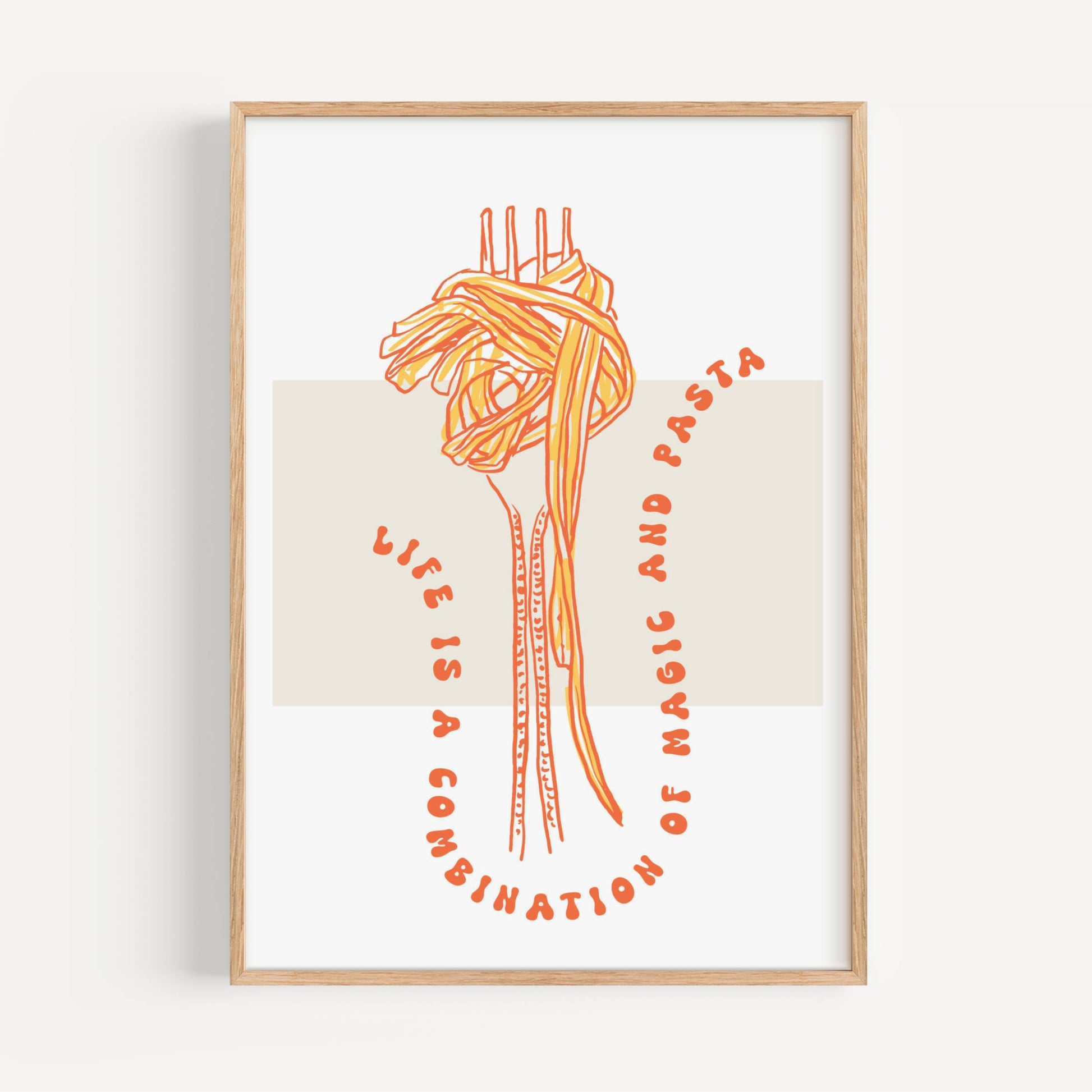 Lámina decorativa de espaguetis con trazos rojos y amarillos sobre fondo beige. Incluye el texto 'Life is a combination of magic and pasta'. Perfecta para cocinas.