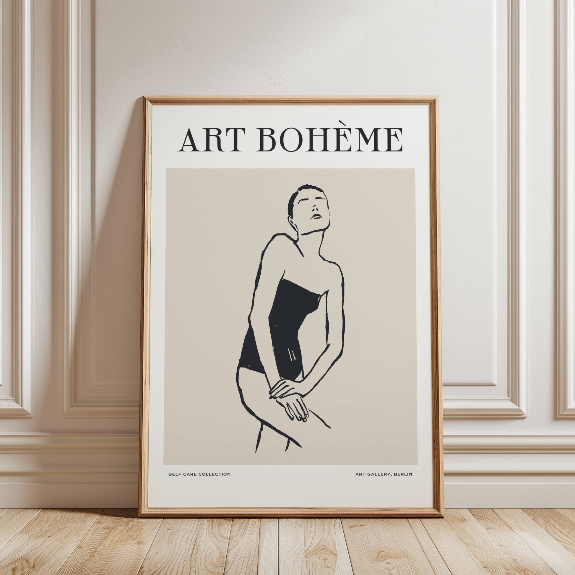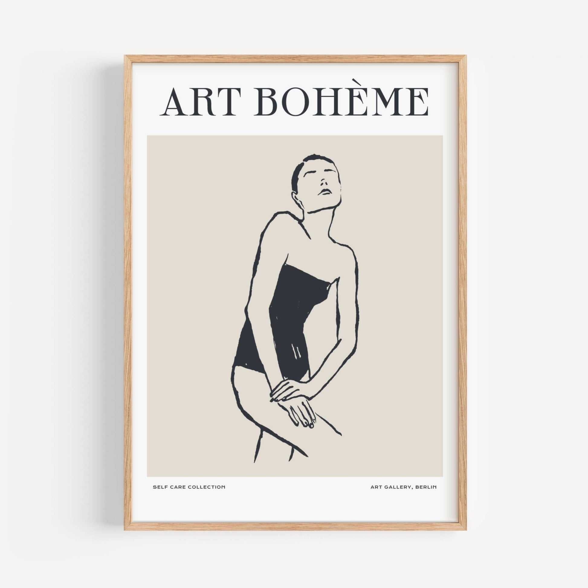 Lámina decorativa de una figura estilizada con trazos simples en negro sobre fondo beige. El diseño minimalista muestra una pose artística con el título 'ART BOHÈME' en la parte superior. Perfecta para dar un toque moderno al salón o dormitorio.