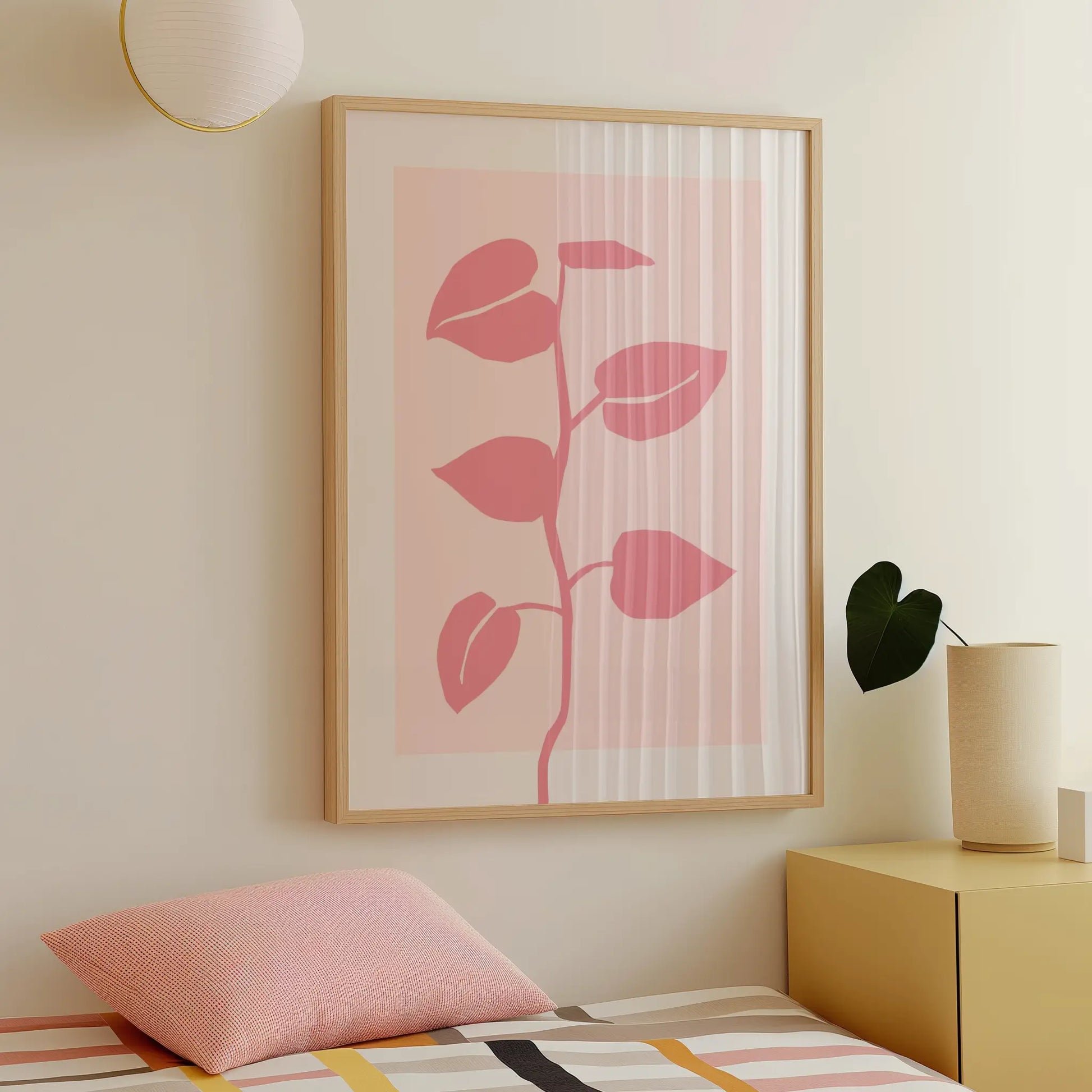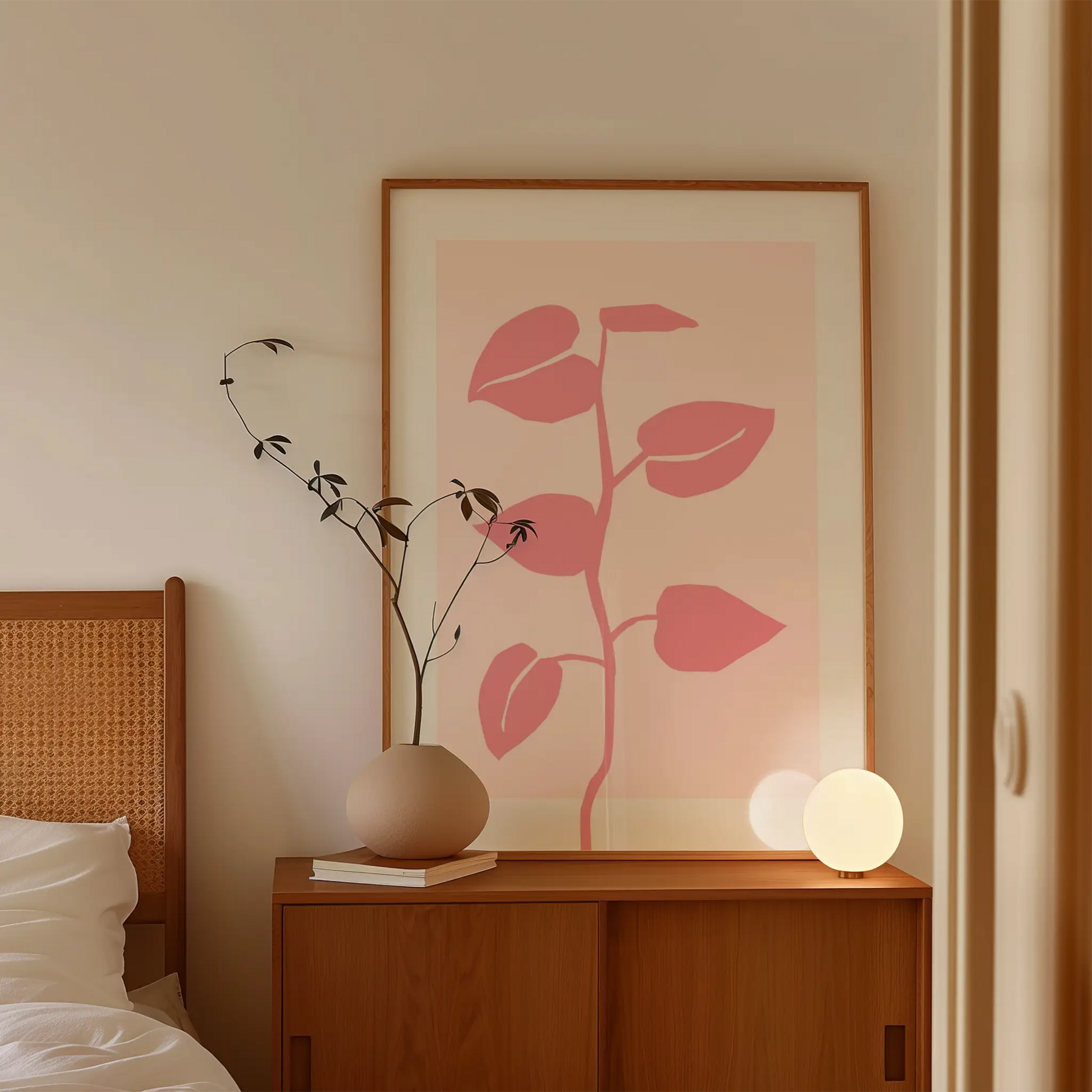 Lámina decorativa de una rama sobre fondo rosa claro. Incluye elegante borde blanco hueso. Perfecto para dar un toque fresco y moderno a tu decoración.