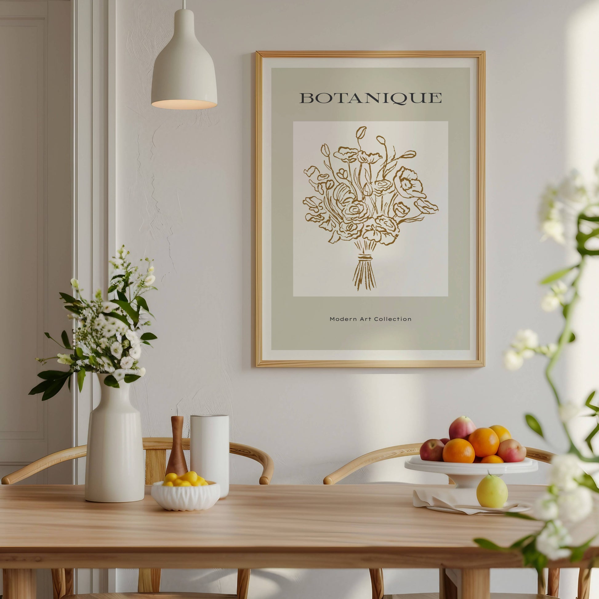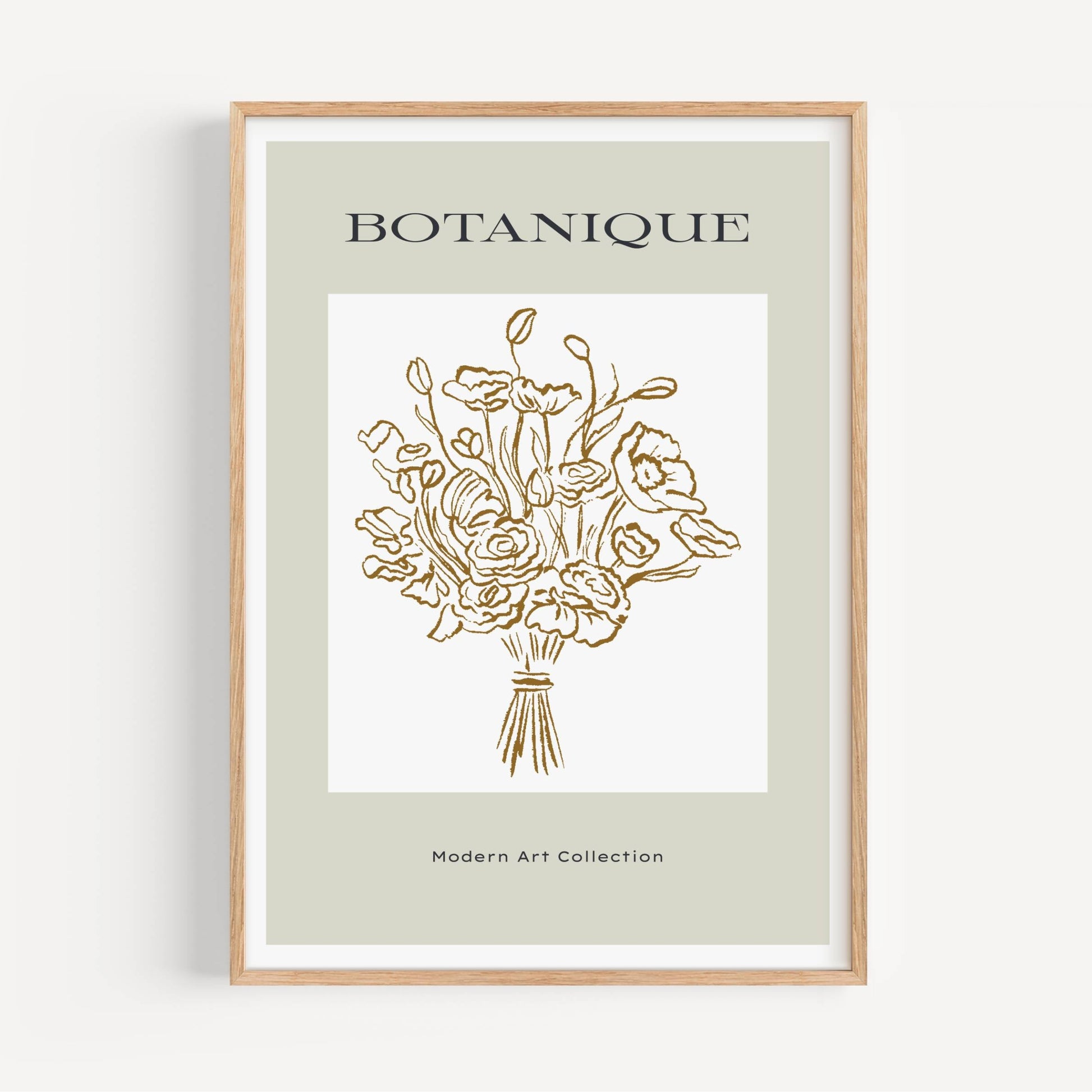 Lámina decorativa de un bouquet floral dibujado en oro sobre fondo blanco con marco beige. El diseño sencillo muestra flores con estilo botánico. Perfecta para dar un toque elegante al salón o dormitorio.
