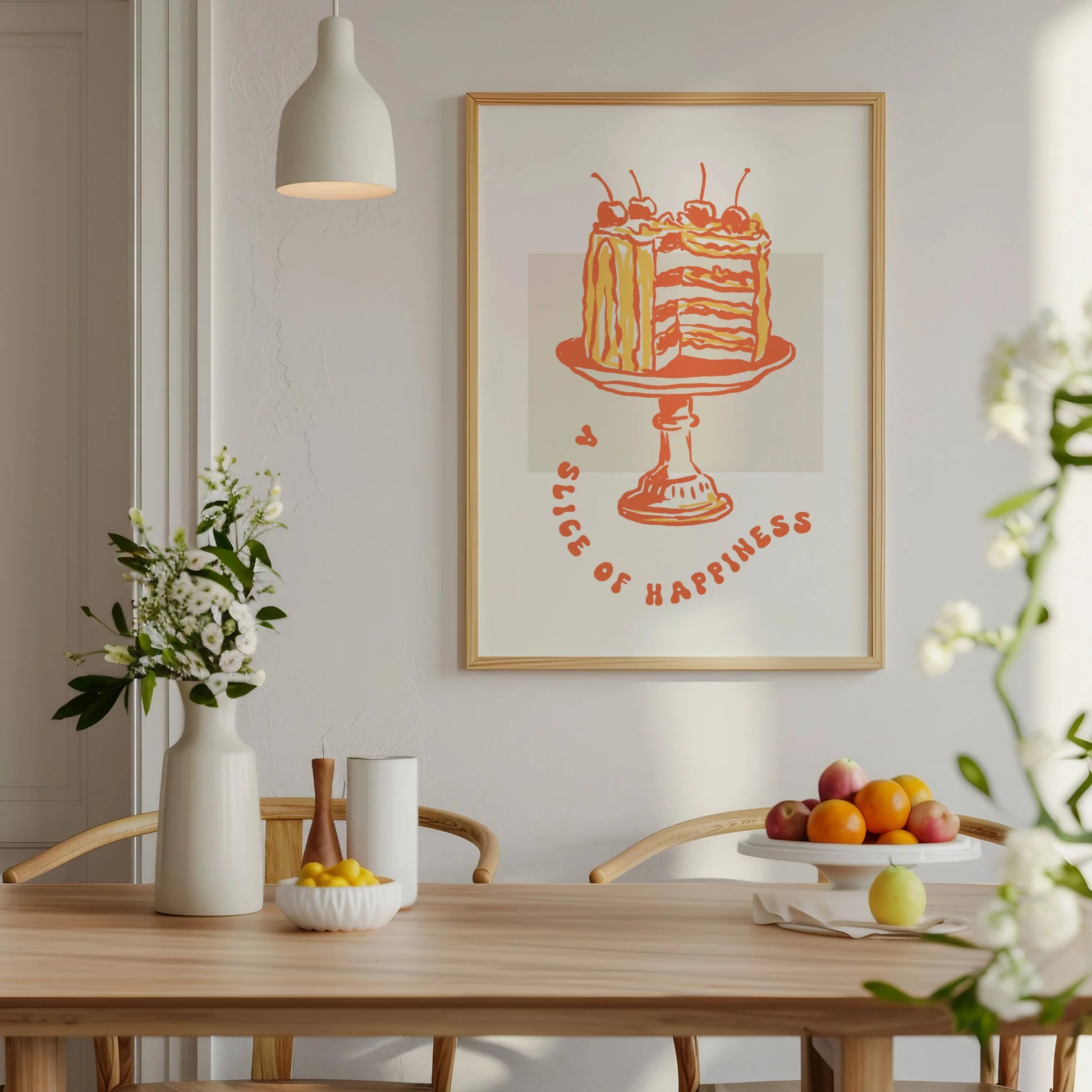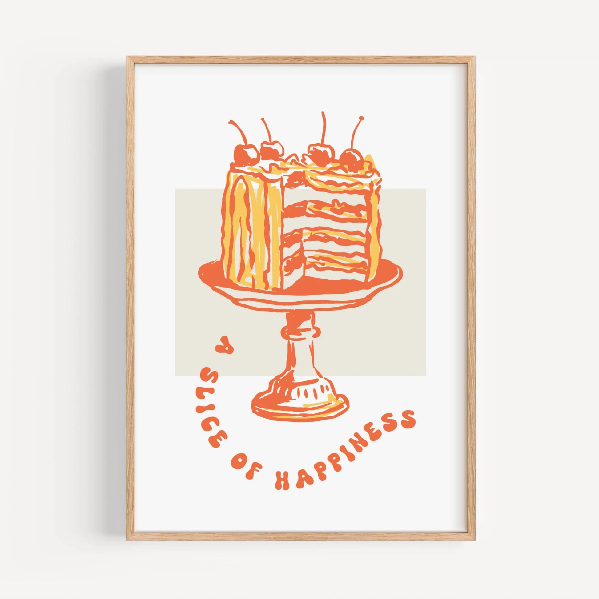 Lámina decorativa de una tarta con cerezas sobre un pedestal. Dibujo en colores rojo y amarillo sobre fondo claro, con el texto 'slice of happiness'. Perfecta para darle un toque divertido a tu pared.