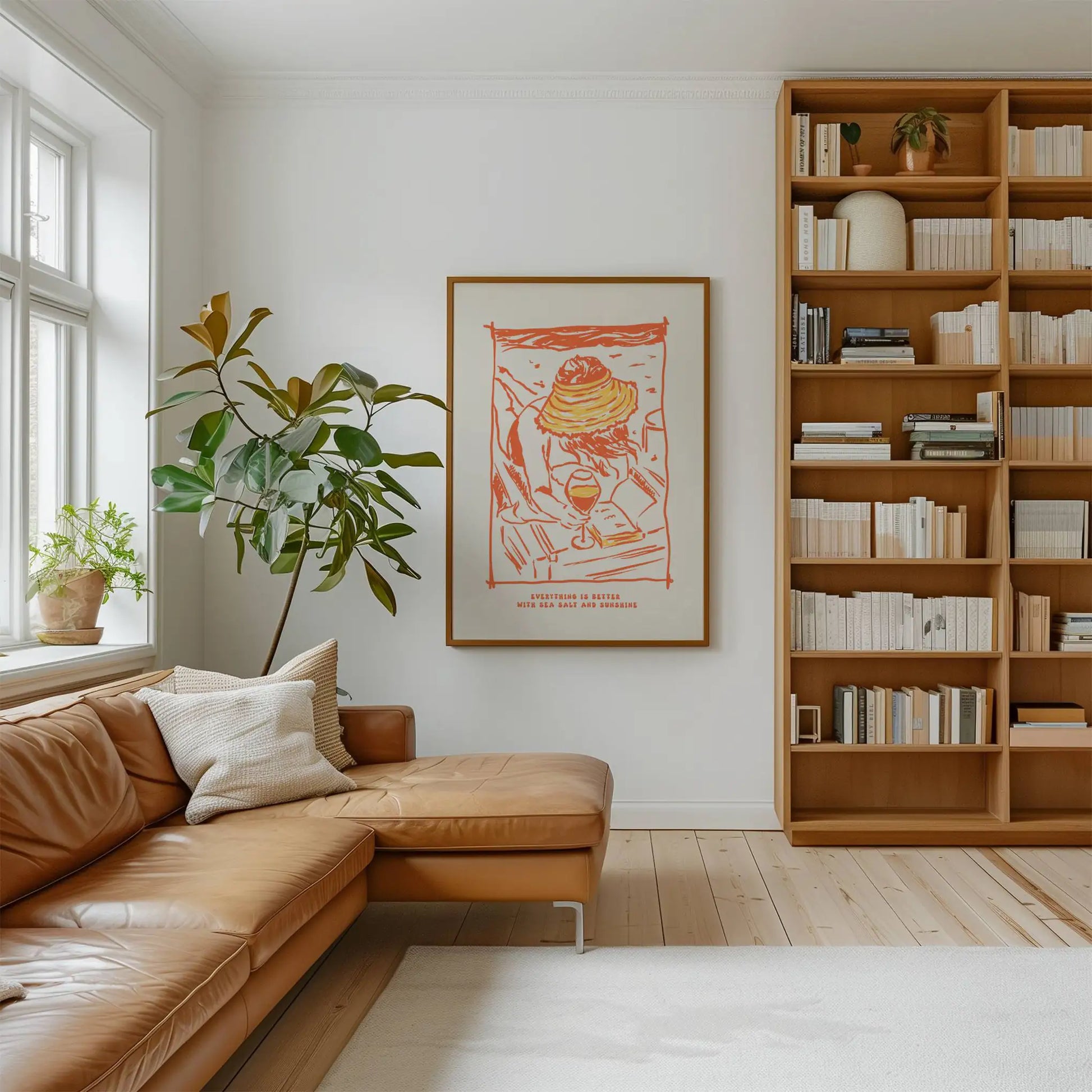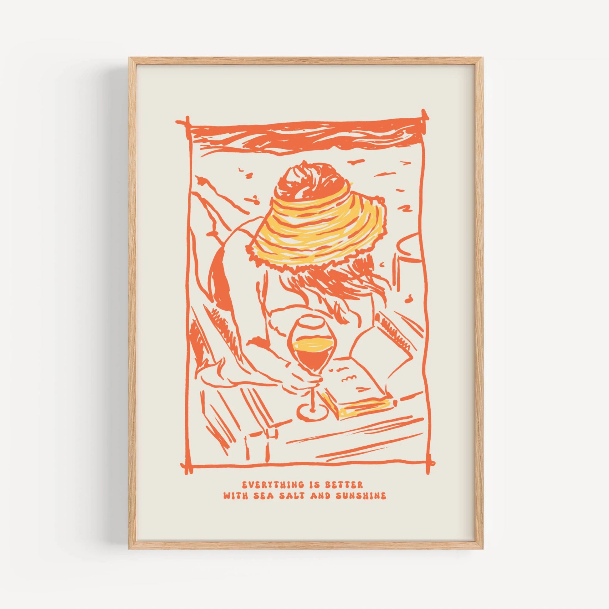 Lámina decorativa de una escena playera con copa de vino y sombrilla en colores naranja y amarillo. Ilustración sencilla con frase sobre sal marina y sol.