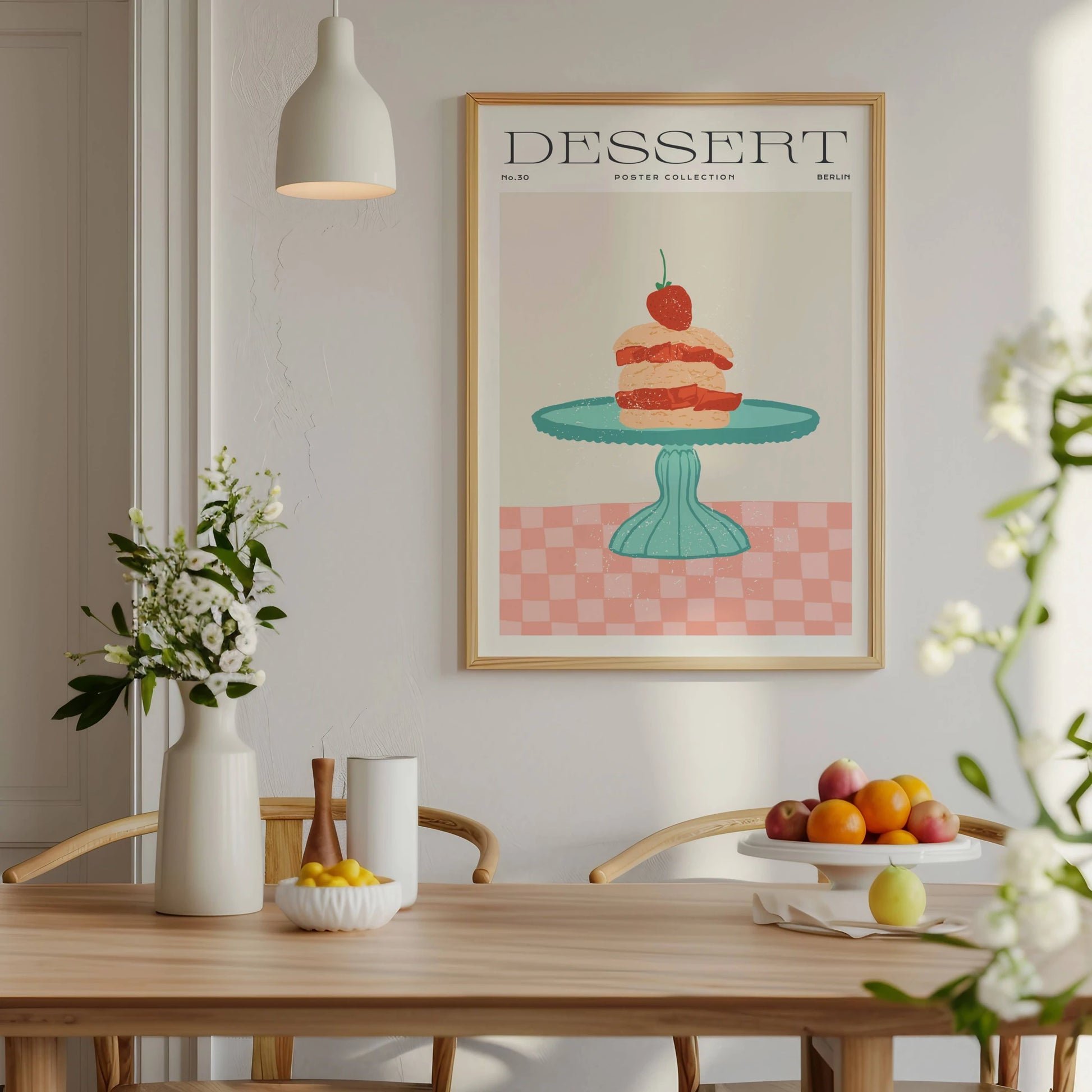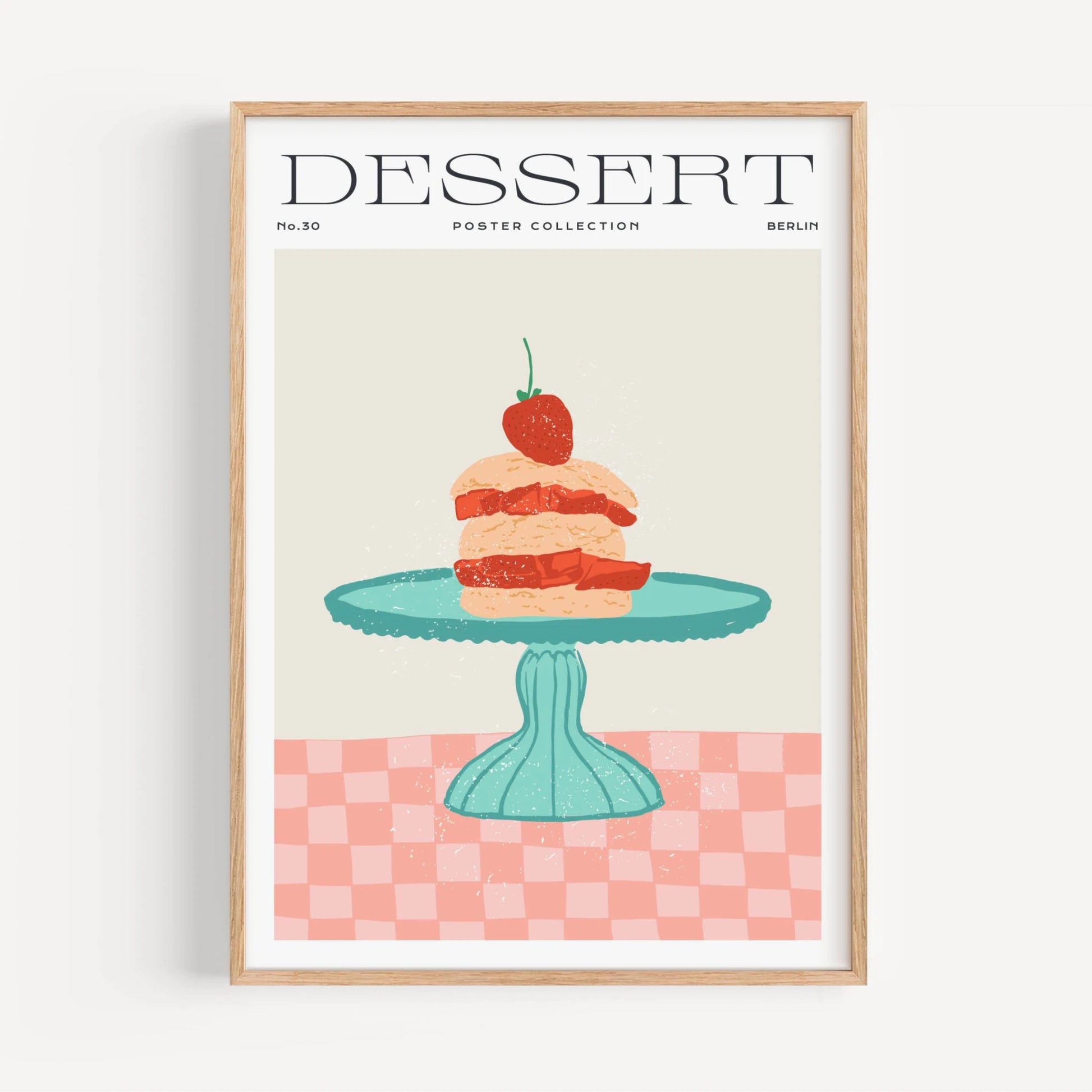 Lámina decorativa de una deliciosa tarta de fresa sobre un soporte verde mint. Los colores rosa, rojo y verde crean un ambiente dulce y acogedor. Perfecta para darle un toque divertido a tu espacio.