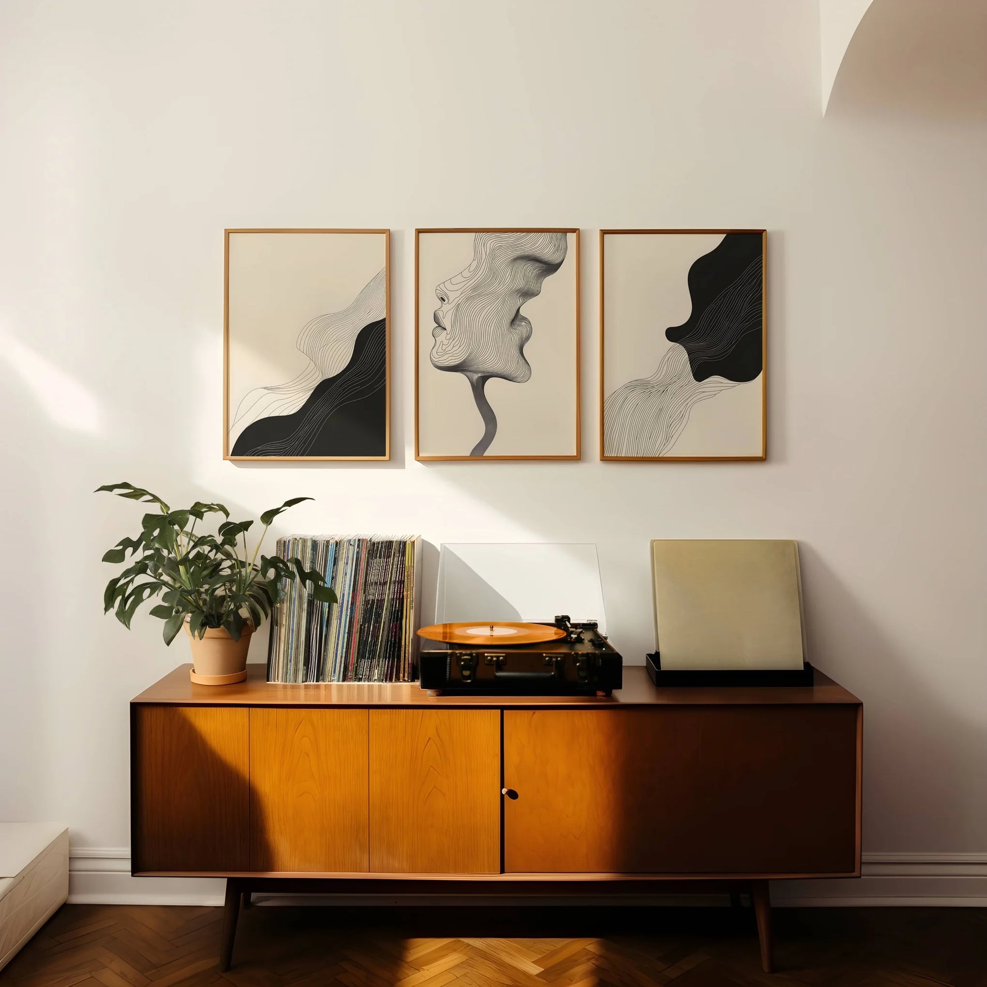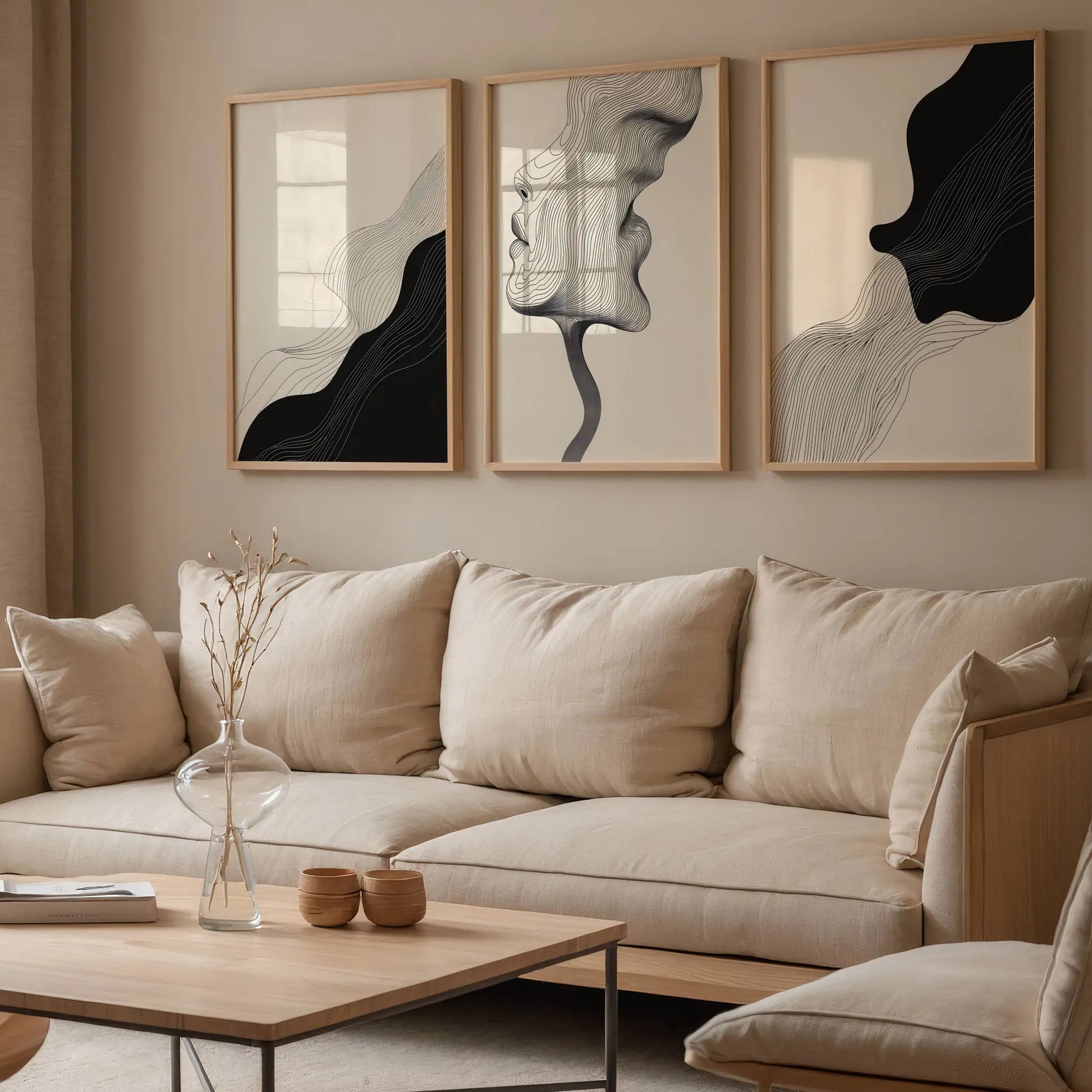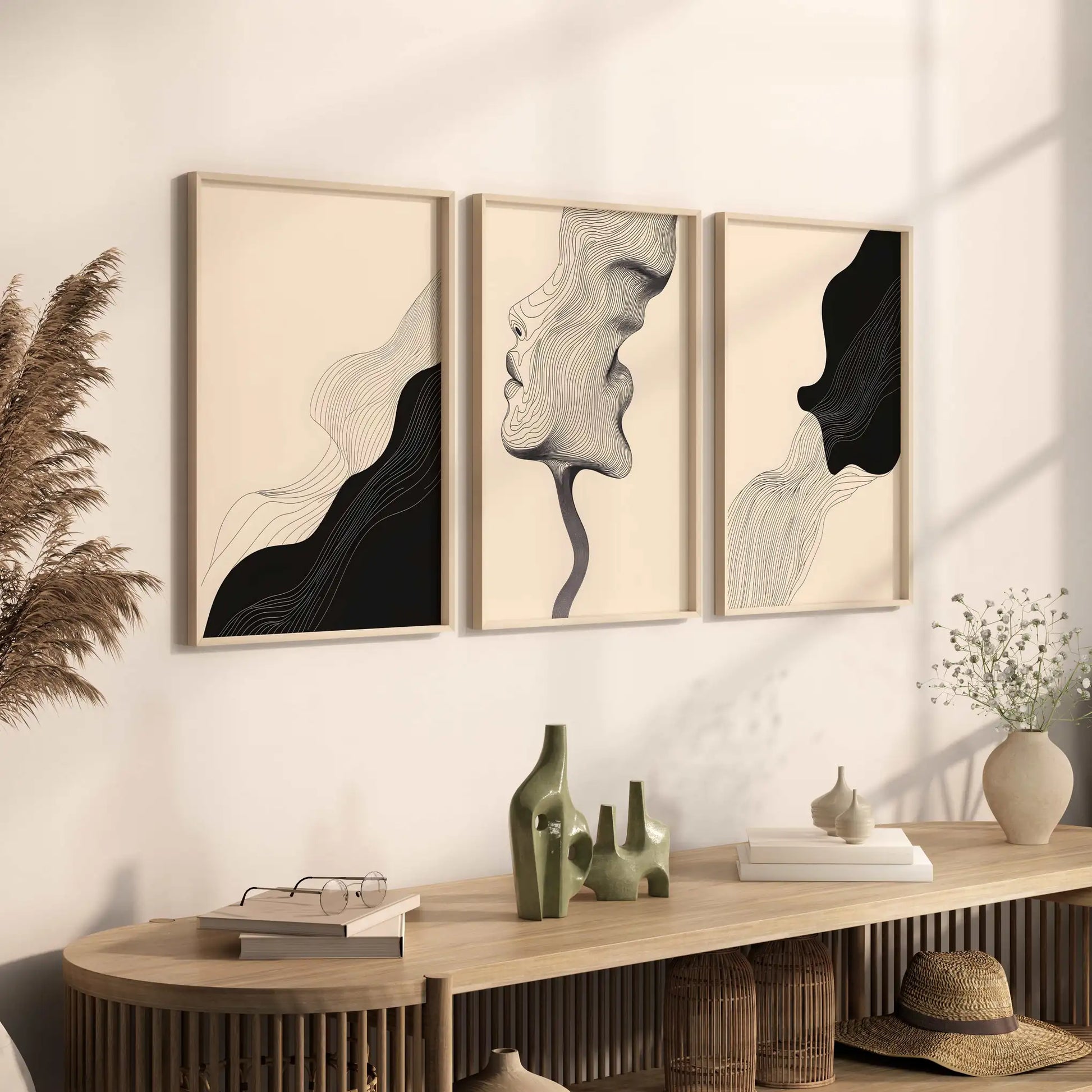 Elegante conjunto de tres láminas abstractas de trazos negros sobre beige. Un rostro femenino como protagonista y dos diseños lineales que lo acompañan. Arte simple que transforma tu espacio.
