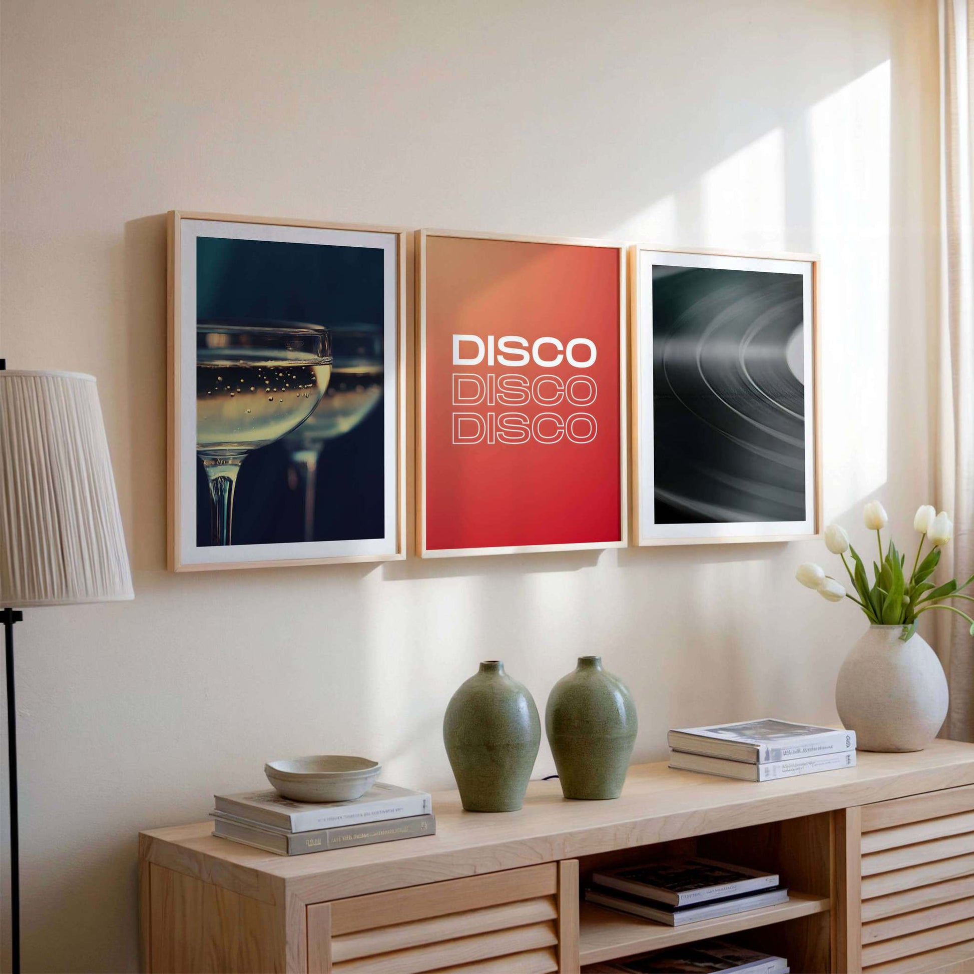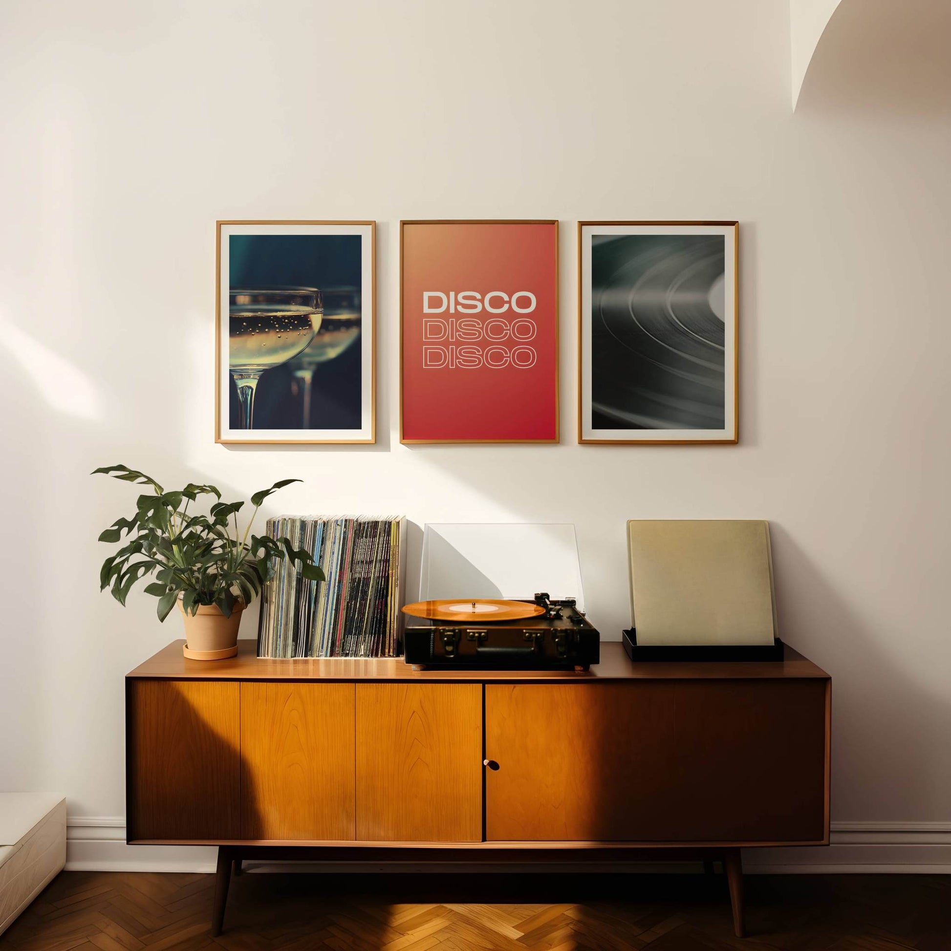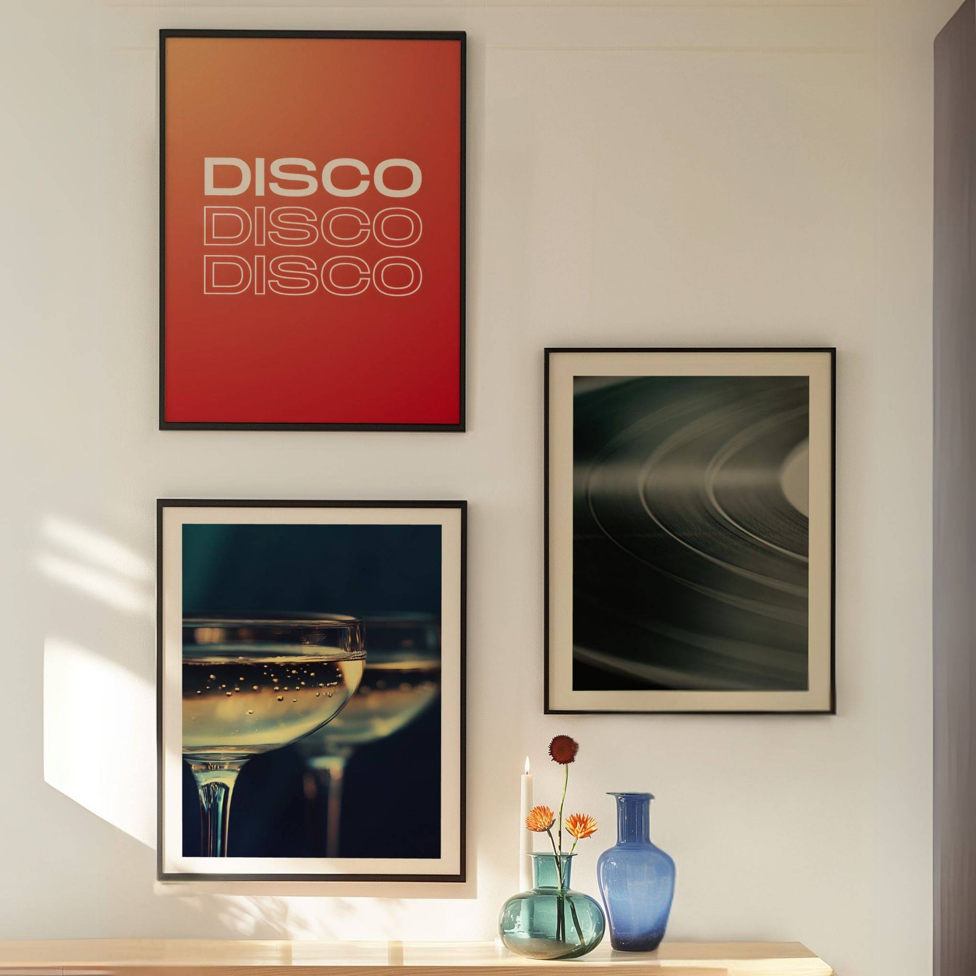 Conjunto de tres láminas que fusionan música y celebración: "Champagne" y "Let It Play" con elegante borde blanco, acompañadas por la lamina tipográfica "Disco".